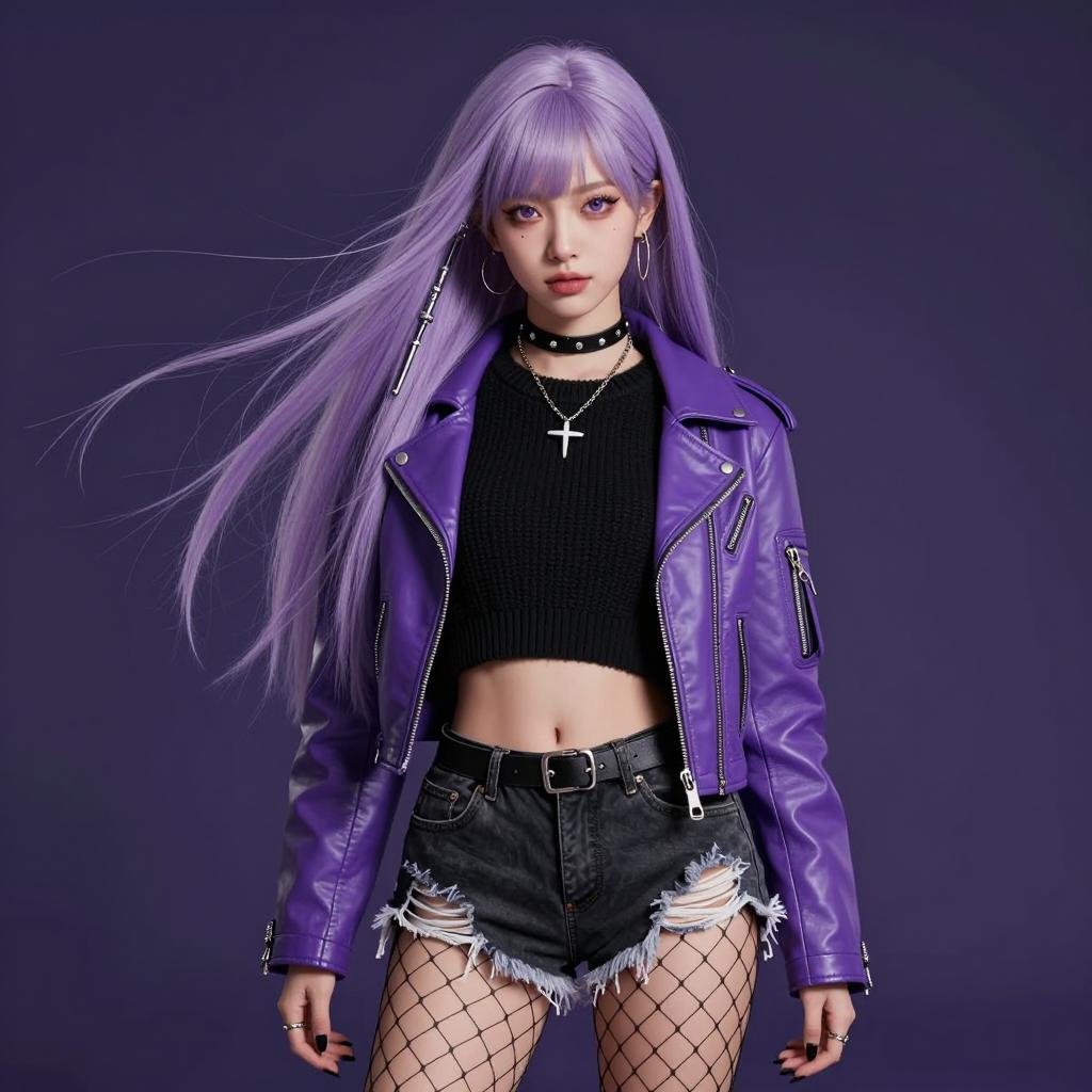 Portrait of a confident young woman with long lavender hair, wearing a purple leather jacket over a black cropped sweater, distressed black shorts, and fishnet stockings. She accessorizes with a choker, cross necklace, hoop earrings, and silver hair clip. The style is bold, contemporary, and cyberpunk-inspired against a purple background.