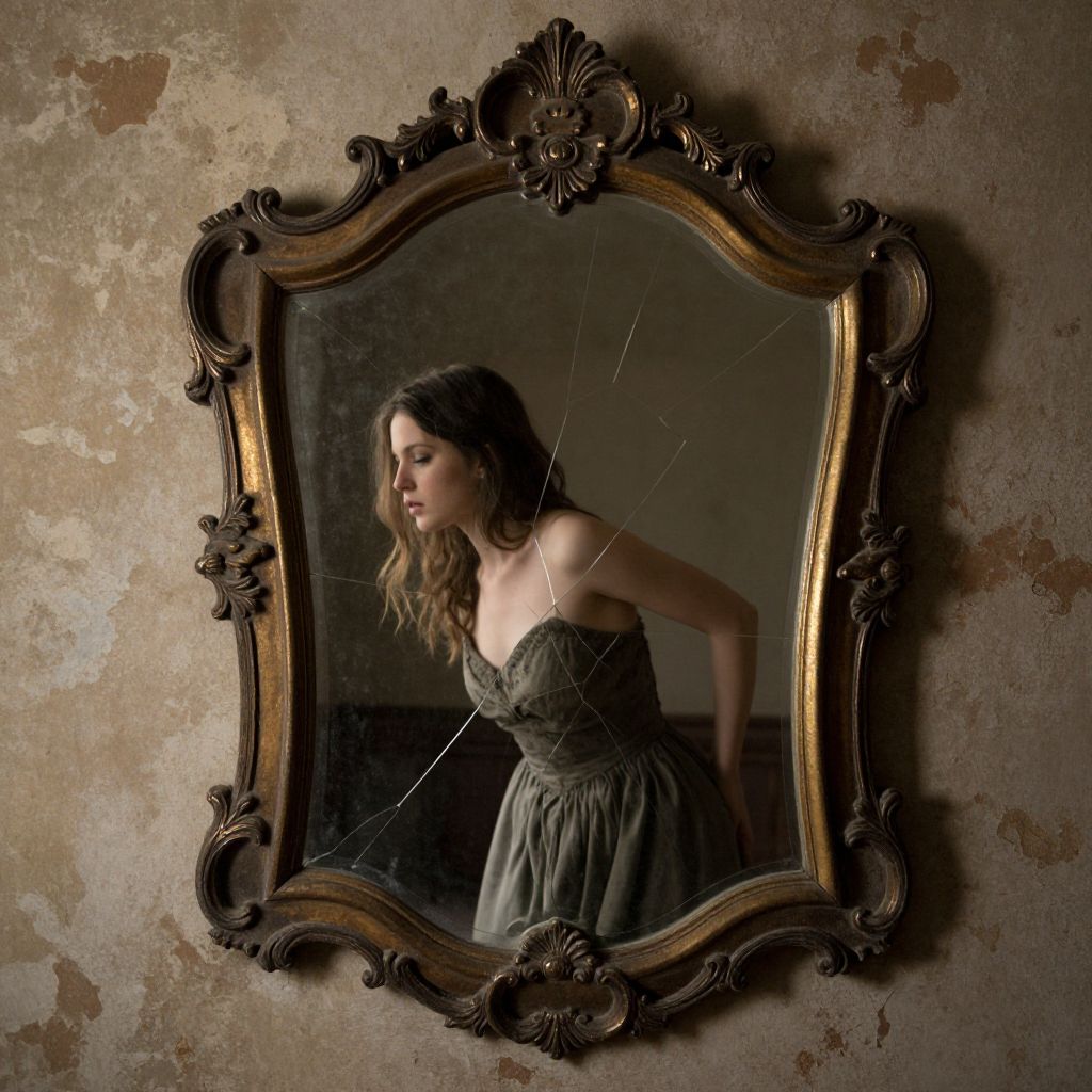 A woman emerges from an ornate, cracked mirror embedded in a weathered wall, her form seamlessly blending with the frame as if stepping between dimensions.