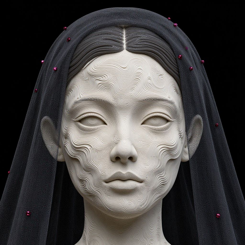 A highly detailed 3D illustration of a female face featuring delicate, organic wave-like patterns across the skin. The figure wears a sheer black veil adorned with small deep red beads against a solid black background. The woman's hair is styled smoothly, parted in the middle, complementing the ethereal and solemn atmosphere of the portrait.