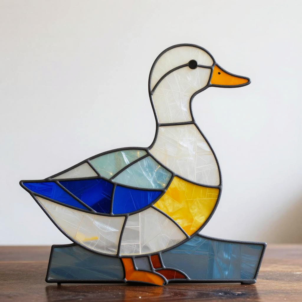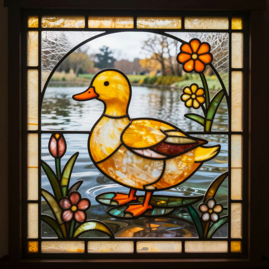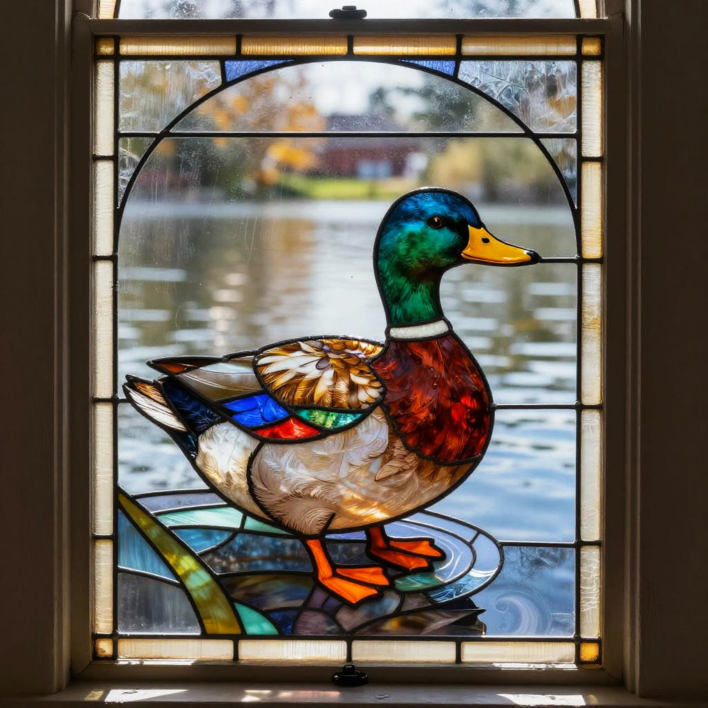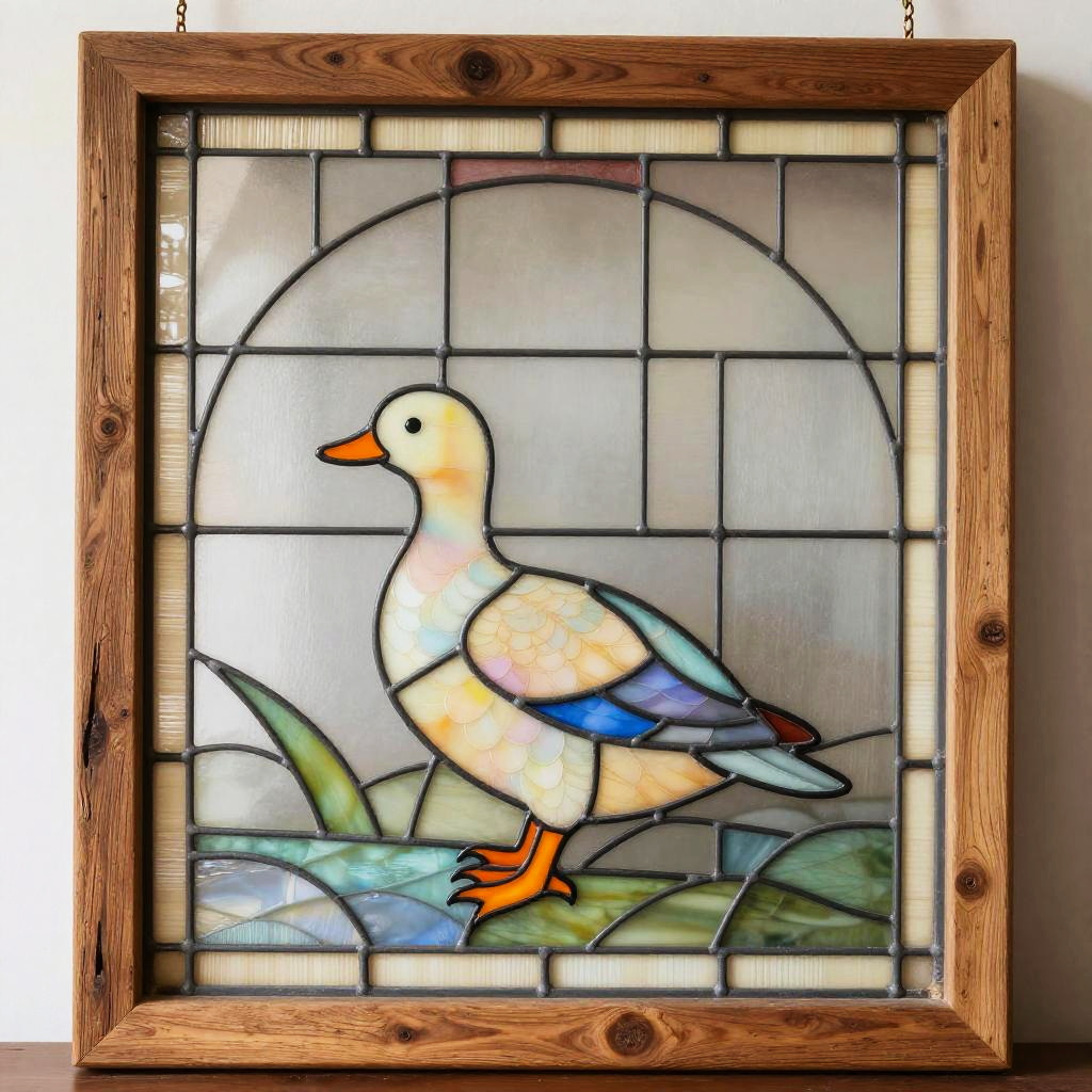 Vintage duck stained glass panel, soft pastel colors, traditional craftsmanship details, set in a rustic wooden frame with natural light enhancing the stained glass brilliance