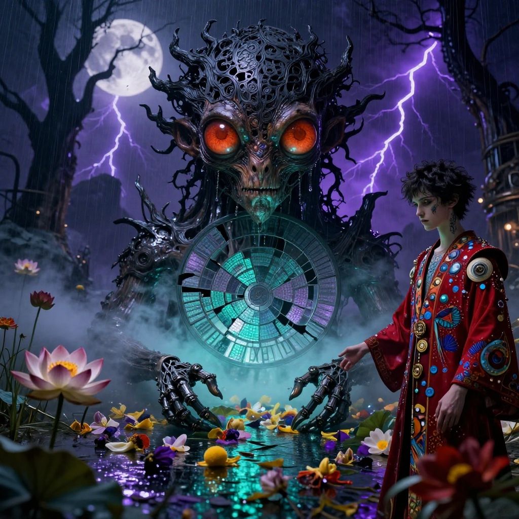 32k hires best quality professional photograph, Dark sci-fi coloured flowery swamp, alien planet, lightning, storm, mystical moon, tattooed biomechanical mutated __wildcards-for-SD-main/mod_monster__, Terracotta eyes, black wood lace, broken circular time merged a colapsed linear time, Aquamarine mist, pile of wilted flowers, glassmorphism pattern, death tree, lotus, Indigo and Violet night, industrial elements, opl, red, adorned in Gustav Klimt-inspired attire, soft Purple and silver shimmer reflection rainy, biomechanical nanobot, egg yolk-gloss, pointillism, Mysteriousdorsiflexioncinematic film still . shallow depth of field, vignette, highly detailed, high budget, bokeh, cinemascope, moody, epic, gorgeous, film grain, grainyJohn Stuart Ingle, natural, shimmering, vibrant, gothic, rpg, 1400ad, ultra detailed, detailed, immersive, reminiscent of high fantasy RPG games, HD, masterpiece, best quality, hyper detailed, super realistic, perfect face, perfect hands, award-winning, professional, breathtaking