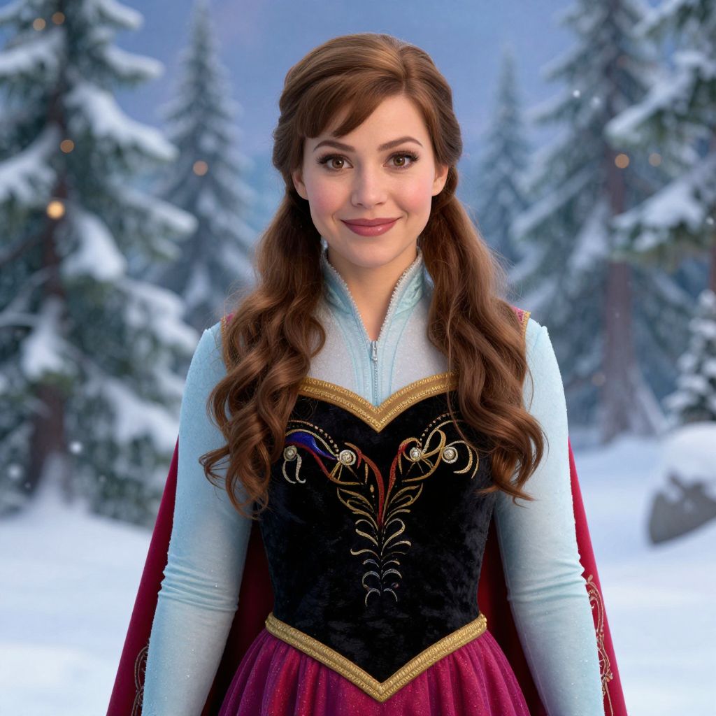 A realistic photograph of a woman in her early 30s with long brown hair, warm brown eyes, and a kind, gentle smile wearing the official Princess Anna frozen dress from the movie, standing in a snowy enchanted forest with pine trees and glowing winter lights in the background, the dress featuring a red and gold embroidery with a flowing skirt, realistic fabric details, and natural lighting.. The woman has big tits and cute face