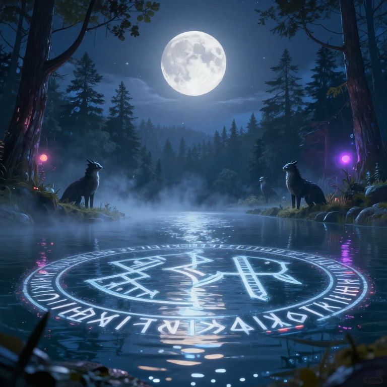 Digital artwork of a moonlit forest with glowing runes on a water surface, surrounded by wolves, illuminated by purple lights.