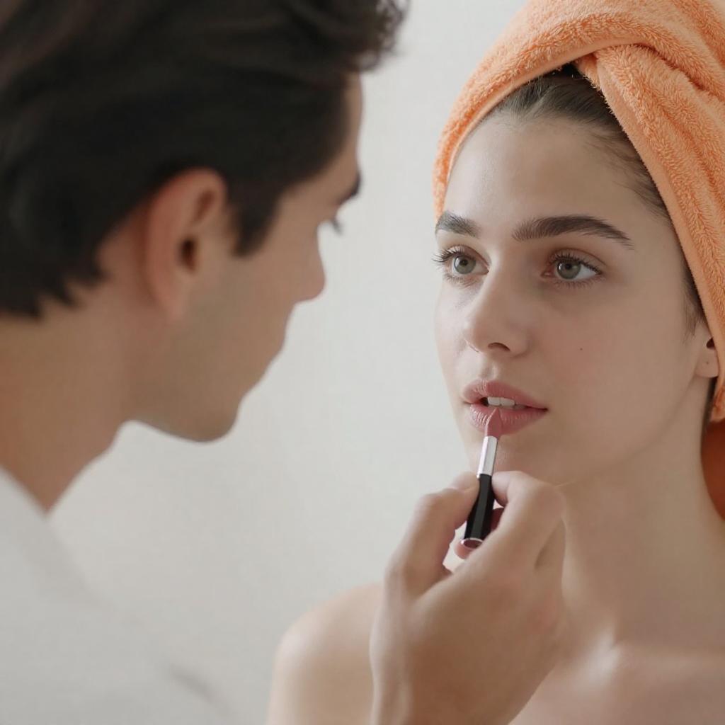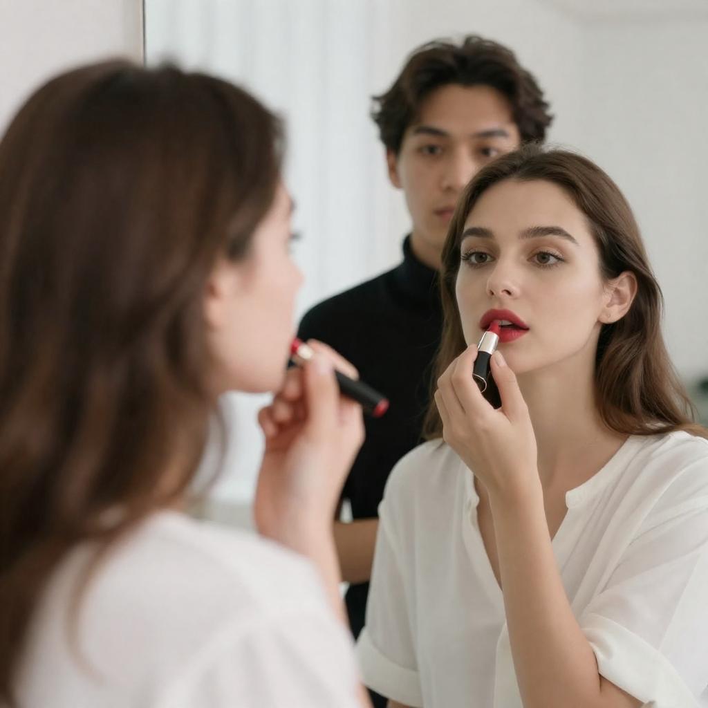 Photograph of a woman with light skin and brown hair, half of her face illuminated, half in shadow. She wears a plaid shirt and holds a makeup brush to her right eye. A grayscale portrait of a man with a stern expression is on the right. Background is blurred with dark and light tones.