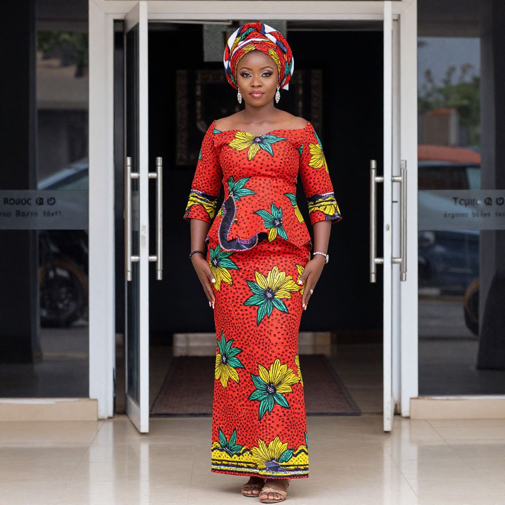 Woman wearing a vibrant red African formal dress with yellow and green floral patterns, complemented by a matching headwrap and elegant earrings, standing gracefully in front of a modern glass door entrance.