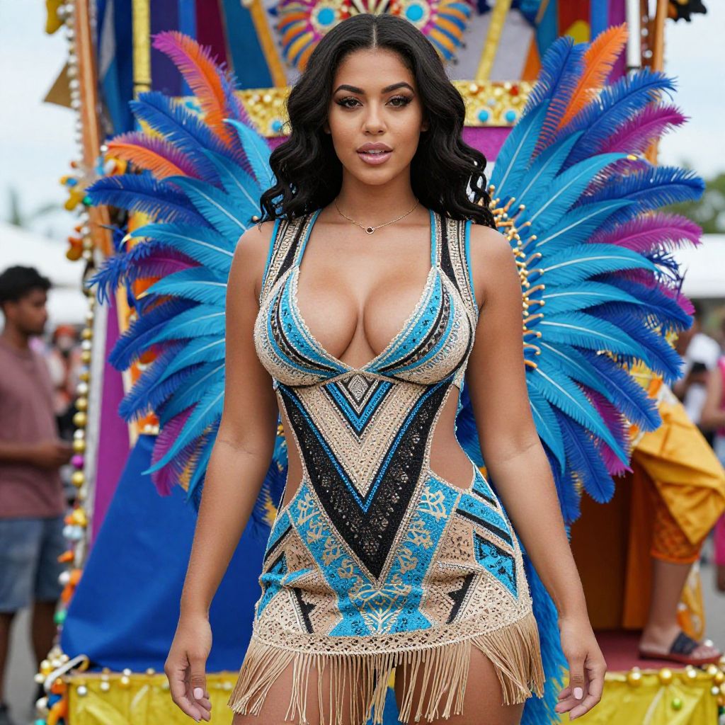 A busty woman in a contemporary bohemian sleeveless mini dress with geometric patterns in blue, black, and beige, lace detailing, and a fringed hemline, stands in a vibrant carnival parade float, her dark hair loose and wavy. Visual style: a1 pictures. Sexy. Pretty face and beutiful eyes Sexy. Pretty face and beаutiful eyes. Big breasts