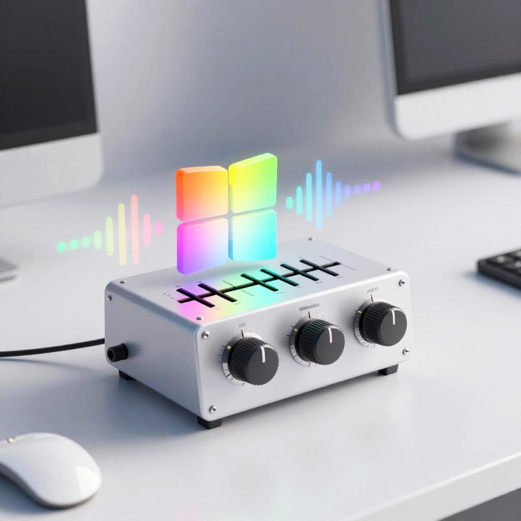 Close-up of Windows audio compressor plugin on a laptop, colorful audio meters and dynamic controls glowing, sound engineer adjusting levels in professional recording studio with warm lighting