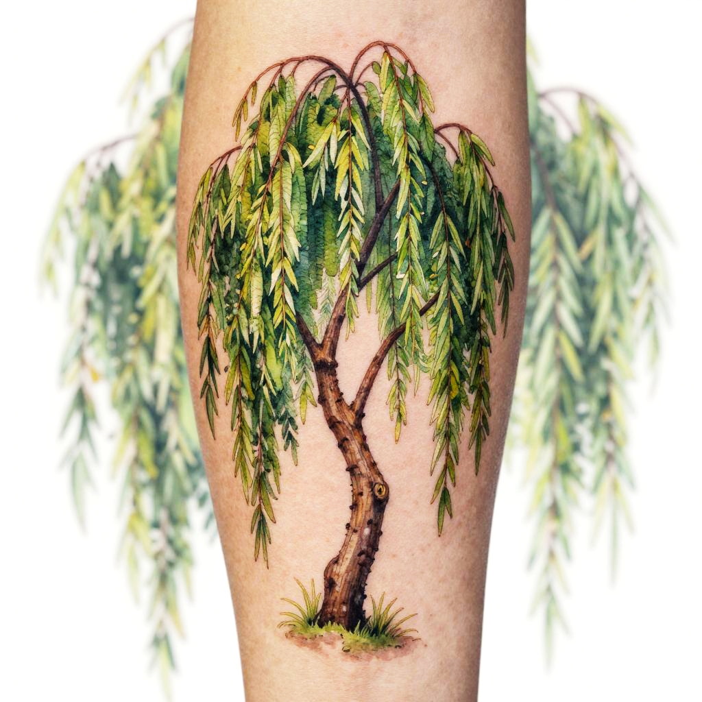 Realistic weeping willow tattoo, detailed and lifelike branches with cascading leaves, shaded in soft greens and browns, intricate bark texture, natural flow around the arm, subtle shadows for depth, elegant and serene design, watercolor background effect