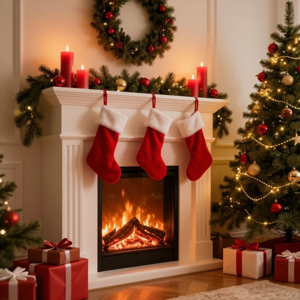 Warm and cozy indoor fireplace decorated for Christmas with three red stockings hanging from the mantle. The mantle is adorned with red candles and festive ornaments, complemented by a decorated Christmas tree and wrapped gifts on the side. The scene features soft holiday lighting, creating a festive and inviting atmosphere.