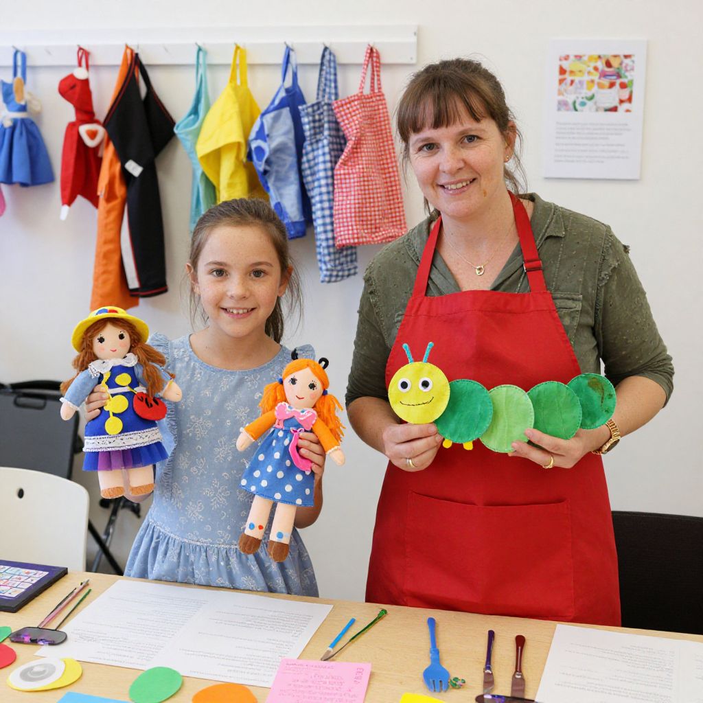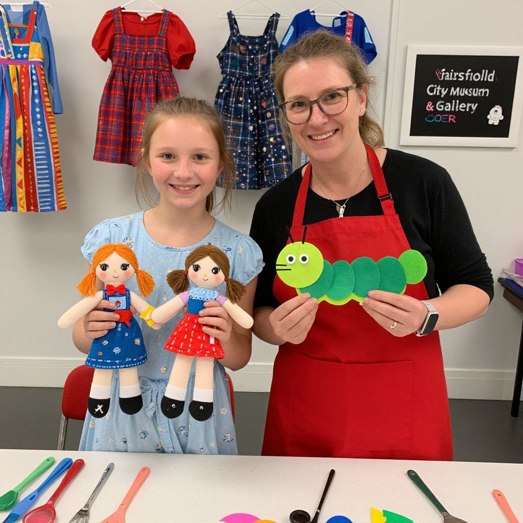 Two enthusiastic participants, a young girl and a slightly older woman wearing a red apron, proudly display their colorful handmade dolls and a whimsical caterpillar craft during a Kids Folk Doll workshop at Fairfield City Museum & Gallery, surrounded by crafting tools and vibrant clothing items hanging in the background.