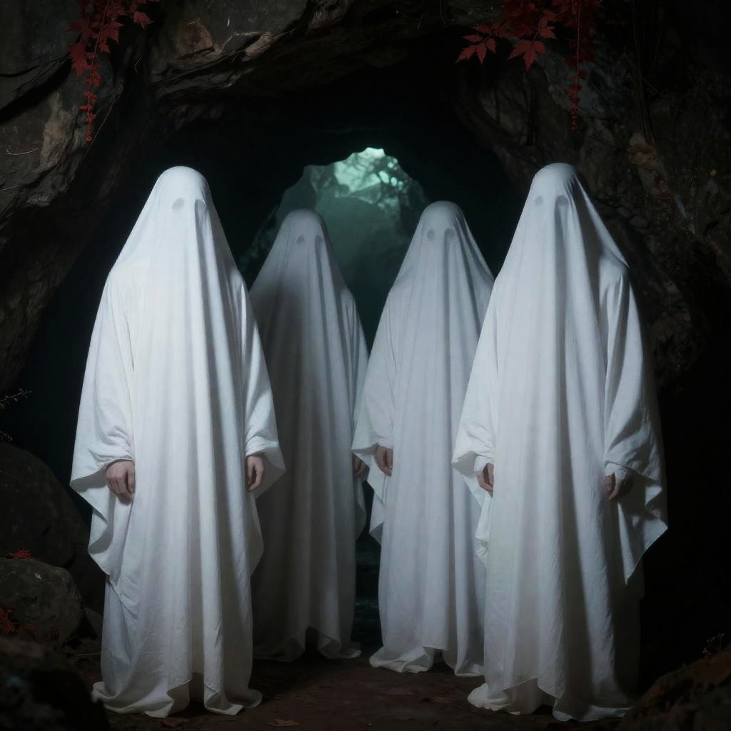 Four ghostly figures draped in white standing inside a dimly lit cave with an opening showing pale teal light outside, eerie and surreal atmosphere, soft ambient lighting casting shadows, surrounding area with muted red foliage and dark earthy ground, mysterious and quiet mood