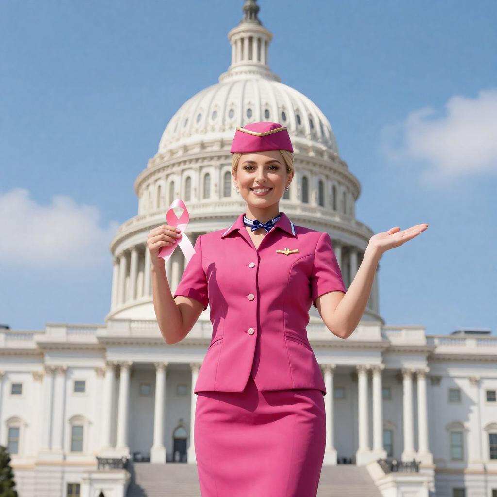 Blonde woman with wavy hair, wearing a pink flight attendant uniform, including a hat, long-sleeve top with a bow, and skirt. She smiles, holding a pink strap in her right hand. Blue sky background. She stands centrally, slightly leaning forward with arms out.