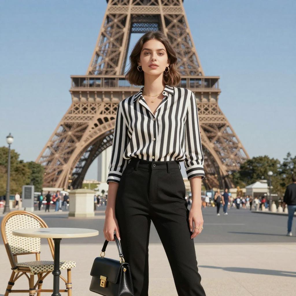 Photograph of a confident young woman with shoulder-length brown hair standing in front of the Eiffel Tower on a sunny day. She's wearing a black and white striped blouse with black high-waisted pants, holding a black handbag with gold accents. She's standing near a table with a checkered chair, looking directly at the camera. The background shows a clear blue sky and a few trees.