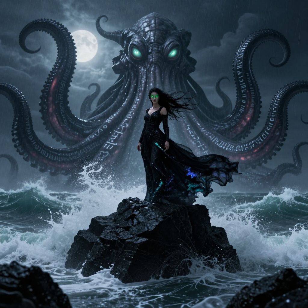 Macabre style Midnight, churning black seas, a weathered galleon with tattered sails bursts from shadowy depths, its hull silhouetted against a blood-red moon, sails billowing full of wind, a colossal kraken rises from the depths, tentacles thrashing, snapping jaws dripping with bioluminescent venom, style of Frank Frazetta, waves crashing against the ship, ominous foreboding atmosphere, dark, gothic, grim, haunting