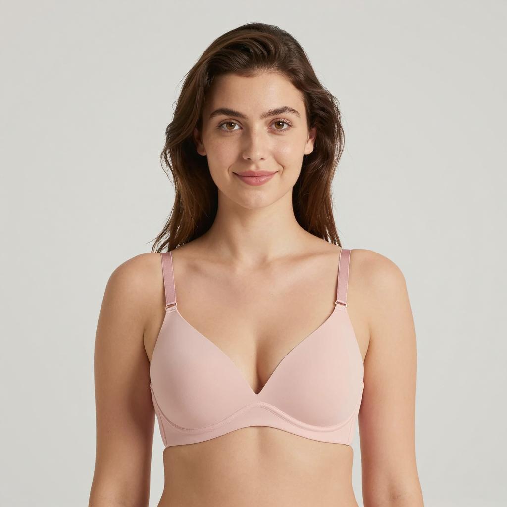 Portrait of a young woman with fair skin and long brown hair wearing a pink bra with thin straps. She has brown eyes and a subtle smile, facing slightly to the right. The background is plain and light-colored.