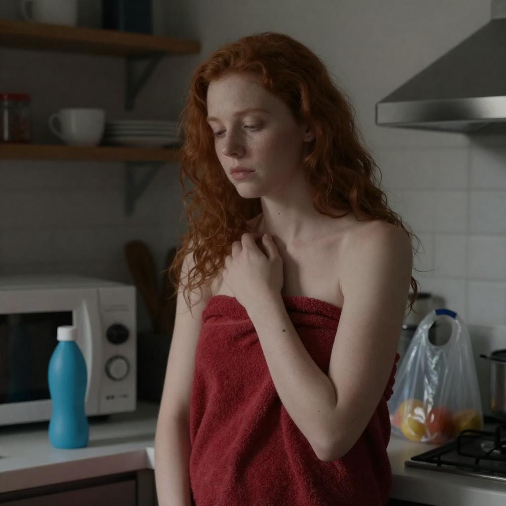 Red-haired woman with fair skin, wearing a red towel, standing in a dimly lit kitchen. Blue bottle, microwave, and plastic bag on counter in background. Shelves with items above her head. Downcast expression. Number of people: 1.