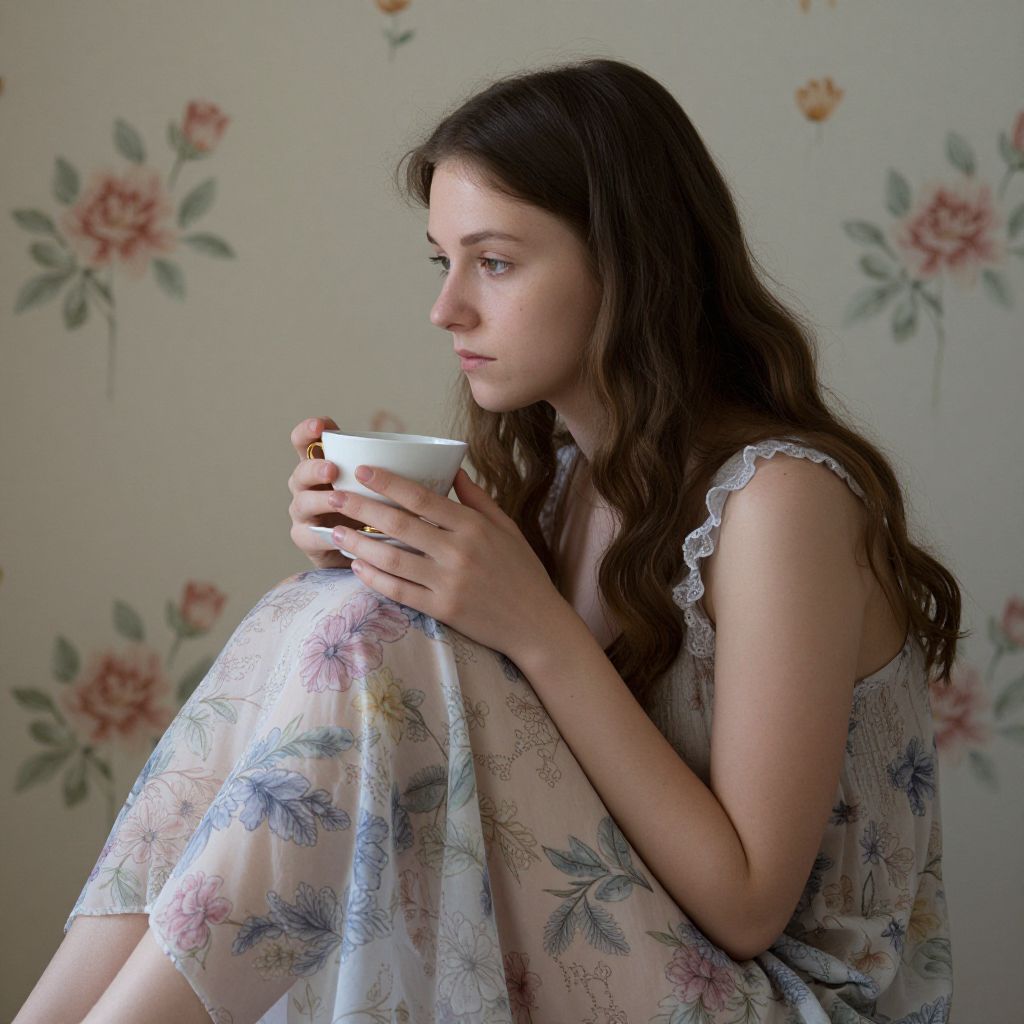 Photograph of a young Caucasian woman with fair skin and long, wavy brown hair, sitting and holding a white ceramic cup with red accents in her right hand. She is wearing a semi-sheer, light-colored floral dress with blue and pink flowers. Her expression is contemplative as she gazes to the left. The background features a light-colored wallpaper with a pattern of pink and yellow flowers. The soft lighting enhances the gentle and serene atmosphere of the image. The woman's delicate features and soft textures of her dress and the wallpaper create a calming, vintage aesthetic.