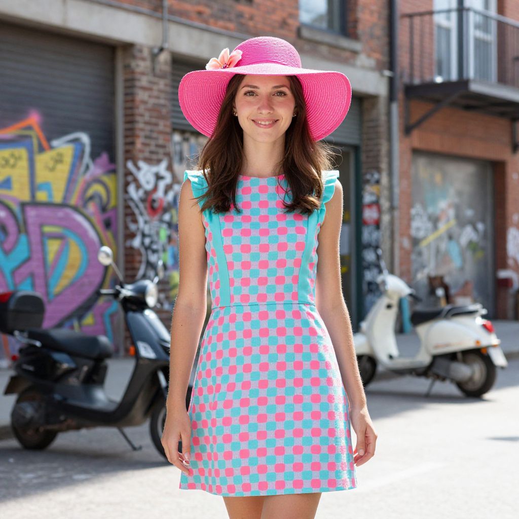 Smiling fair-skinned woman with long brown hair wearing a bright pink wide-brim hat decorated with a flower. She is dressed in a sleeveless, knee-length dress featuring a pink and turquoise checker pattern with turquoise shoulder accents. The photo is taken on a sunlit urban street with colorful graffiti on brick walls and two vintage scooters parked behind her.