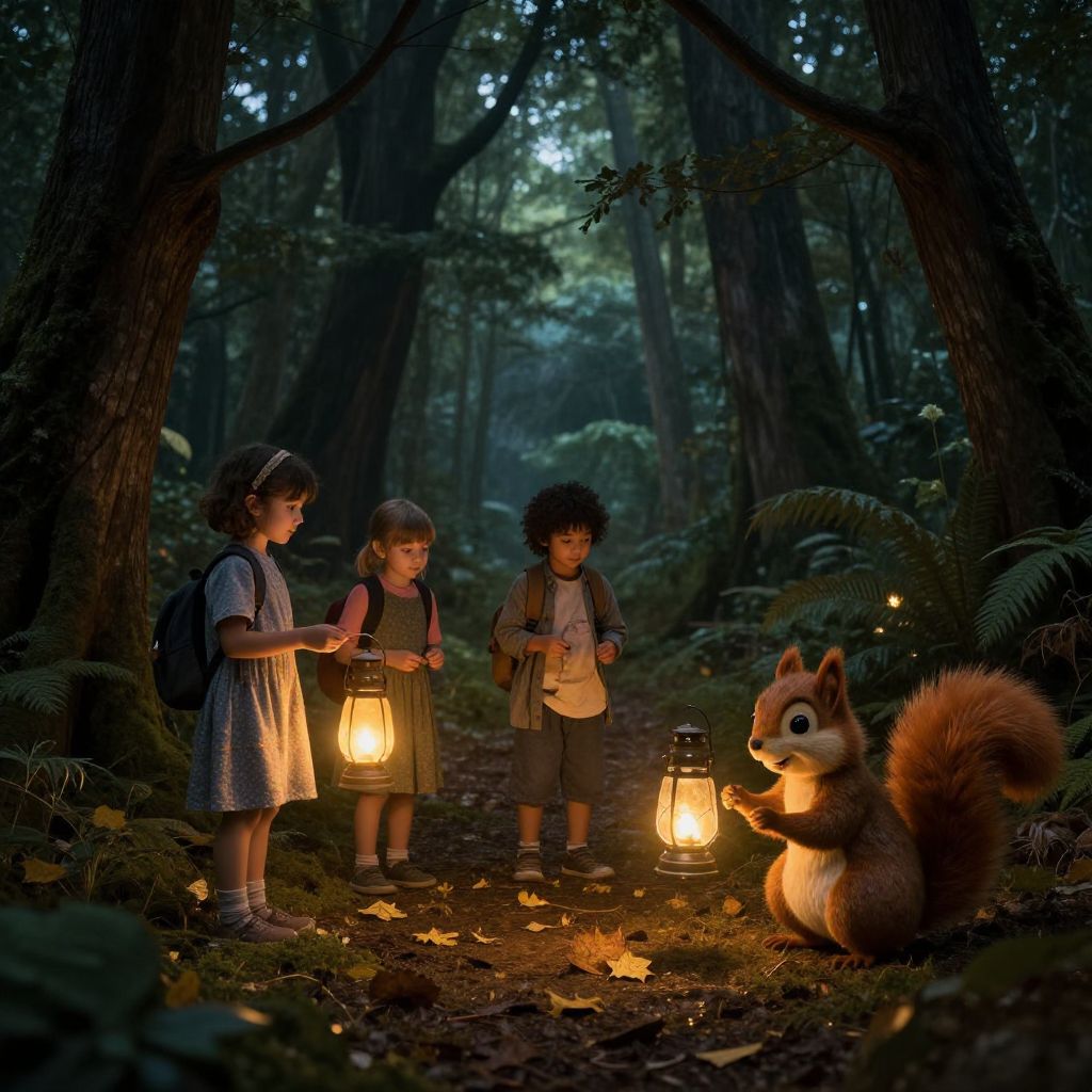 Prompt for kids photo in a magical forest clearing with children holding lanterns, glowing leaves, and a friendly squirrel mascot, ethereal lighting, serene environment, detailed textures, imaginative and safe setting for young minds, cinematic style.