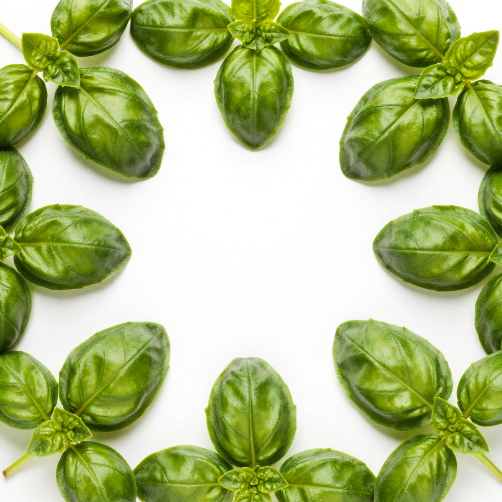 This is a close-up photograph of fresh basil leaves. The vibrant green leaves have a slightly glossy texture, with some lighter green buds visible. They are arranged haphazardly, mostly covering the top and sides of the image, creating a natural border against a stark white background. The leaves have a rich, healthy appearance, and the image has a clean, bright feel.