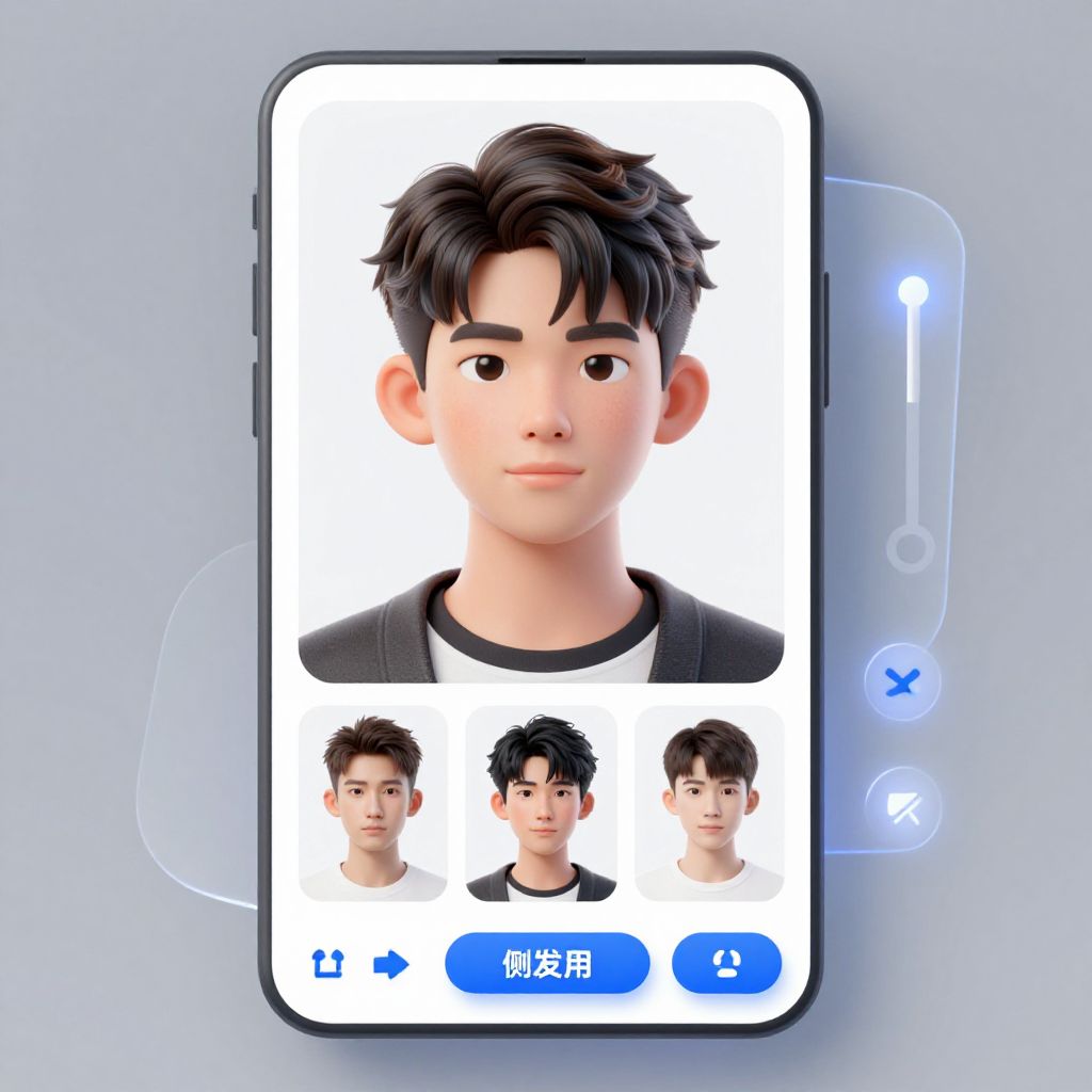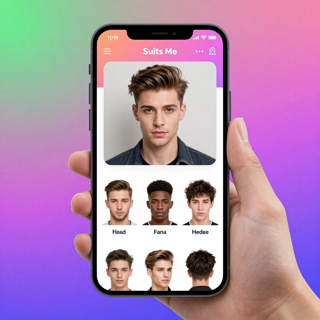 Which hairstyle suits me male app, futuristic 3D digital head model rotating showing multiple male hairstyles layered, app interface with style ratings and customization options, soft lighting and sleek user interface, modern digital fashion innovation