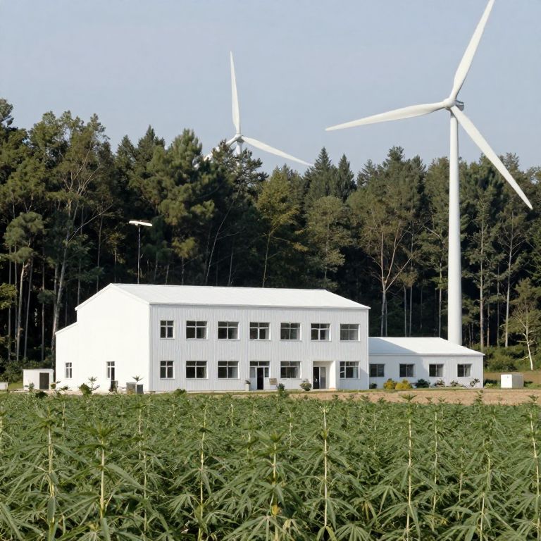 Layering a 1 floor sustainable white factory in the middle of a forest, next to a hemp fibre farm and 3 windmills,