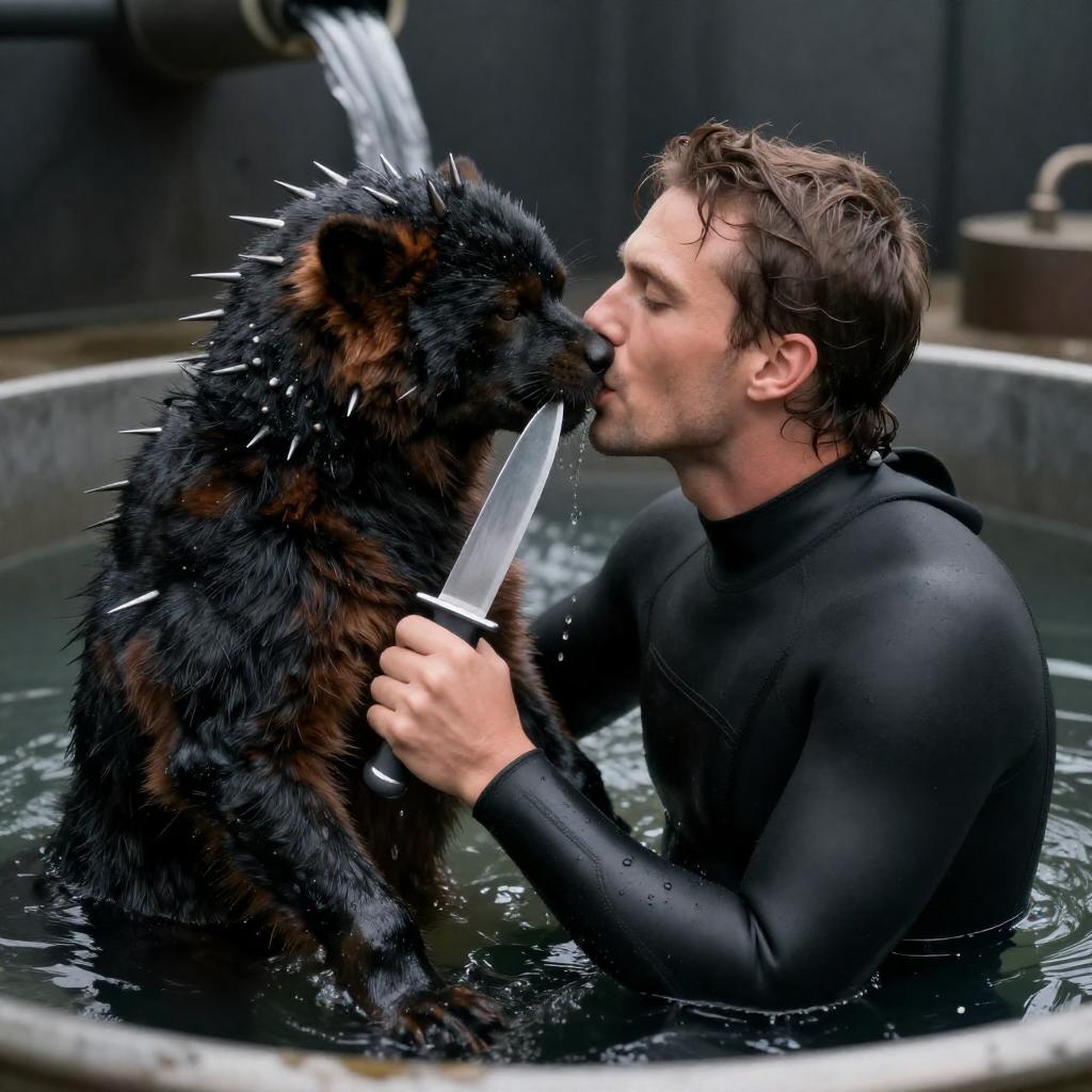 Photograph of a man in a black wet suit, kissing a black and brown fur-covered creature with spiked accessories, holding a knife. They are in a dark, industrial-looking tub with a flowing liquid. Intense, focused expressions. One person.