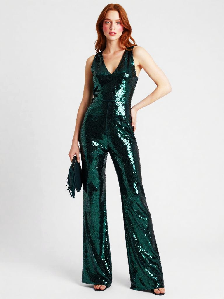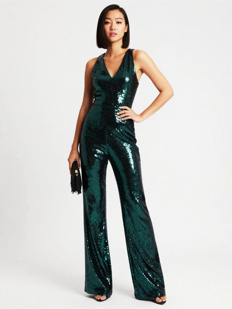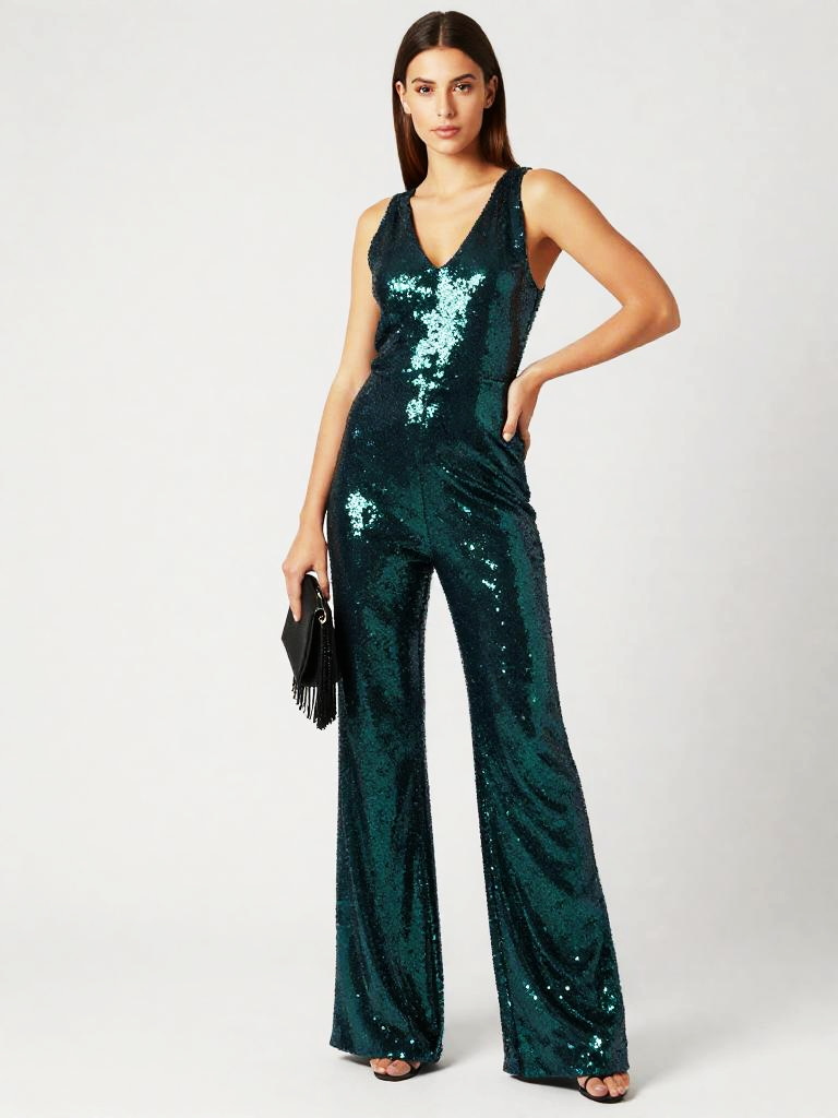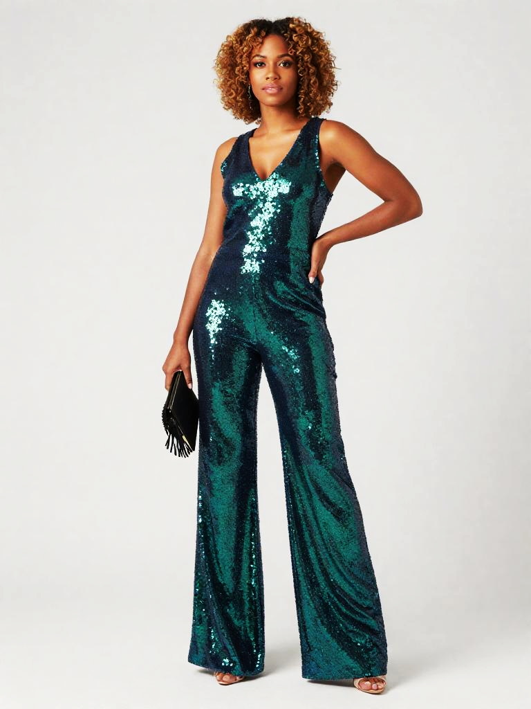 Sequin Jumpsuit, full-body studio fashion photo of tan woman with shoulder-length honey-blonde waves and bronzed makeup wearing a sleeveless V-neck sequin jumpsuit in teal and aqua ombré sequins, wide-leg trousers skimming the floor, model standing with one hand on her hip and the other holding a small fringed clutch at her side, posed at a slight angle to the camera, clean white studio backdrop and bright catalog-style lighting