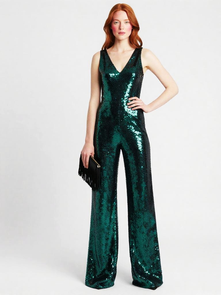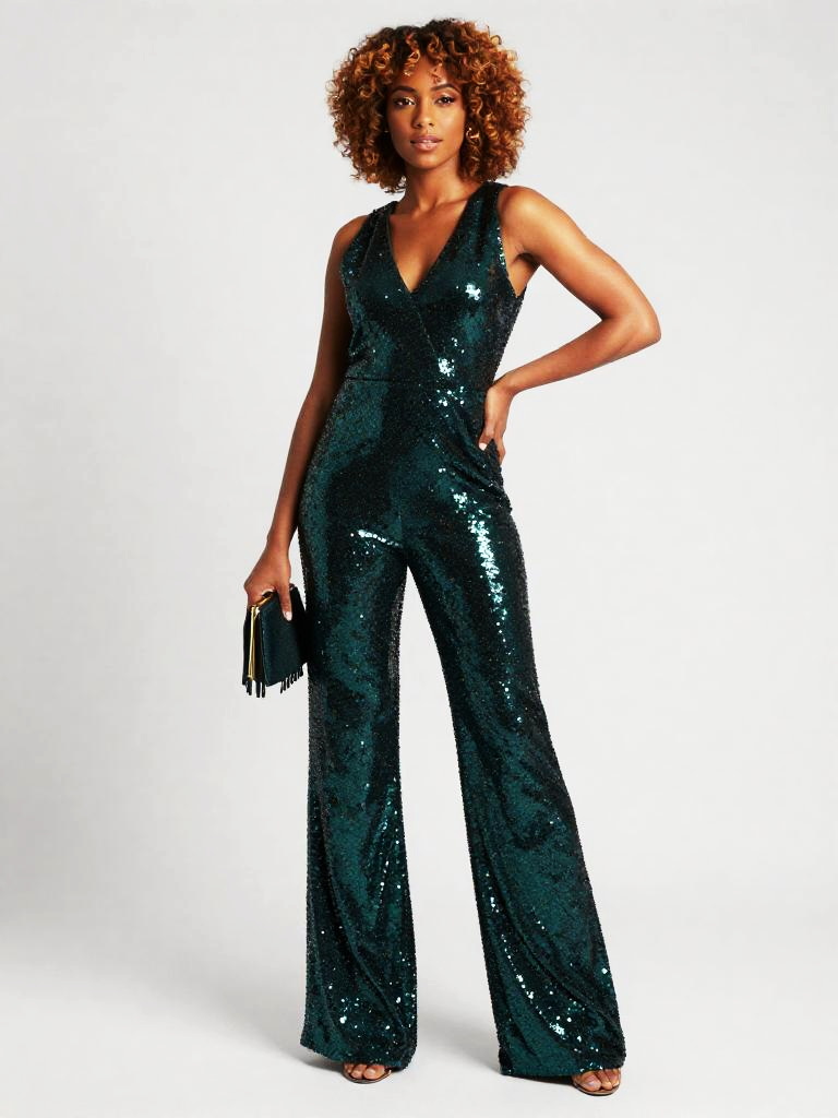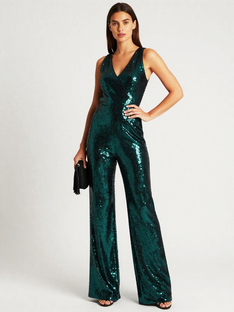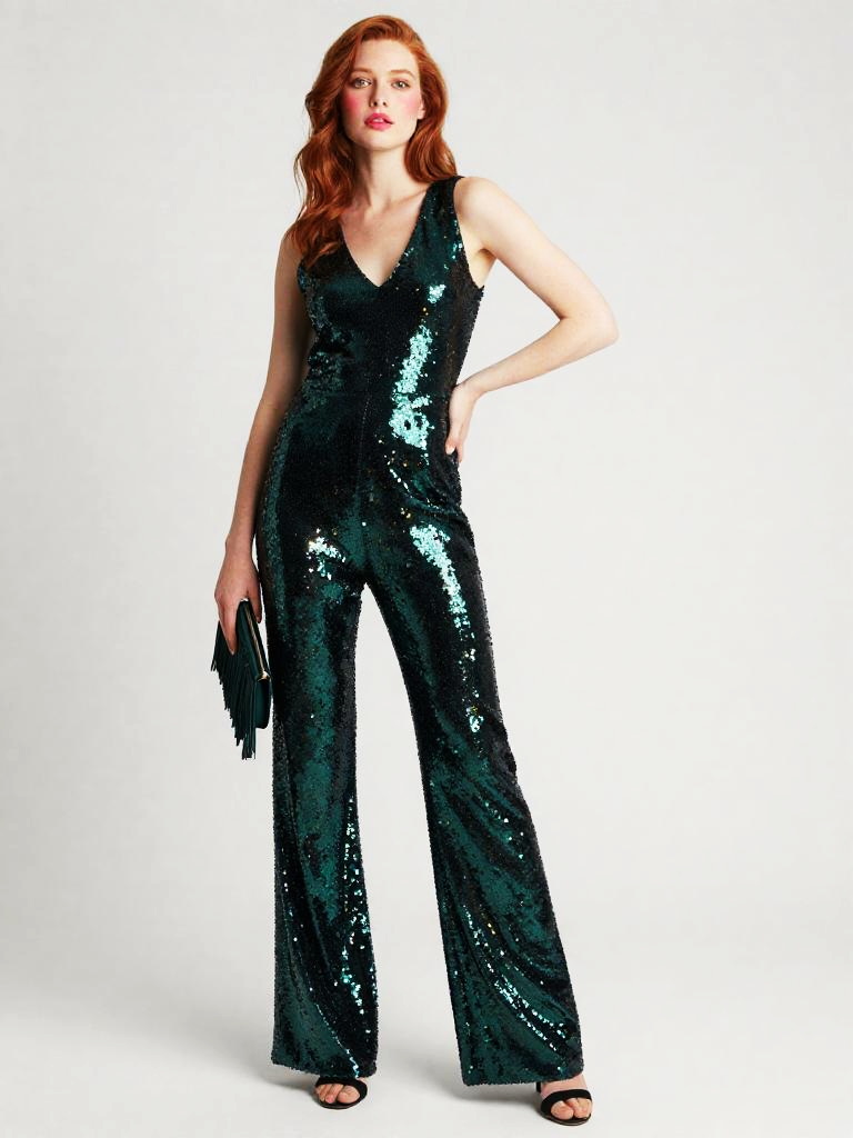Sequin Jumpsuit, full-body studio fashion photo of tan woman with shoulder-length honey-blonde waves and bronzed makeup wearing a sleeveless V-neck sequin jumpsuit in teal and aqua ombré sequins, wide-leg trousers skimming the floor, model standing with one hand on her hip and the other holding a small fringed clutch at her side, posed at a slight angle to the camera, clean white studio backdrop and bright catalog-style lighting