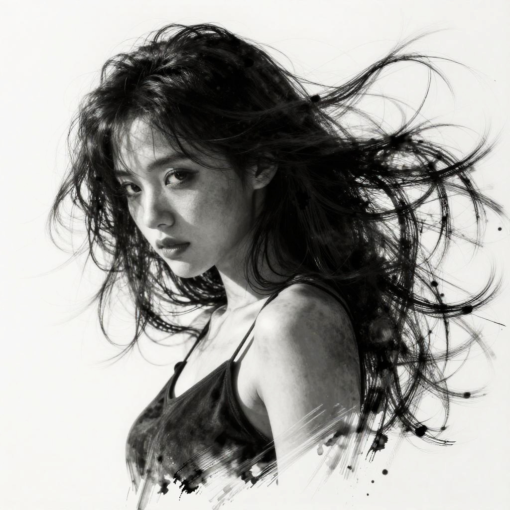 This is a black-and-white digital drawing of an Asian woman with long, wild, and slightly disheveled hair. She has a delicate, youthful face with large, expressive eyes and a subtle, pensive expression. She wears a simple, dark tank top that contrasts with the white background. The artist uses bold, dynamic brushstrokes to convey the texture of her hair and the shadows on her face, creating a sense of movement. The overall style is reminiscent of high-contrast, expressive portrait art. The background is stark white, making the subject stand out prominently.