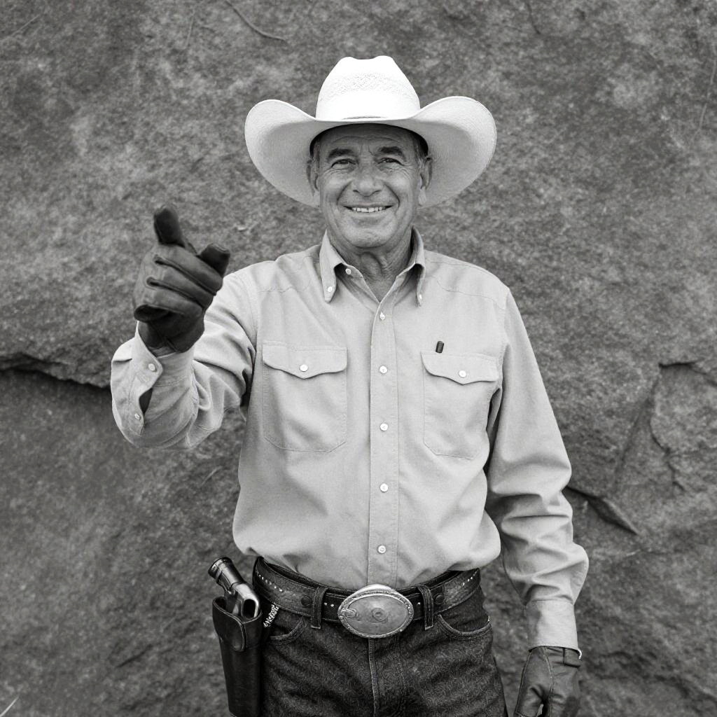 Black and white photograph of a middle-aged man in a cowboy hat, smiling, wearing a button-up shirt, belt with a gun holster, and gloves. He stands against a ured rock wall, pointing with his right hand.