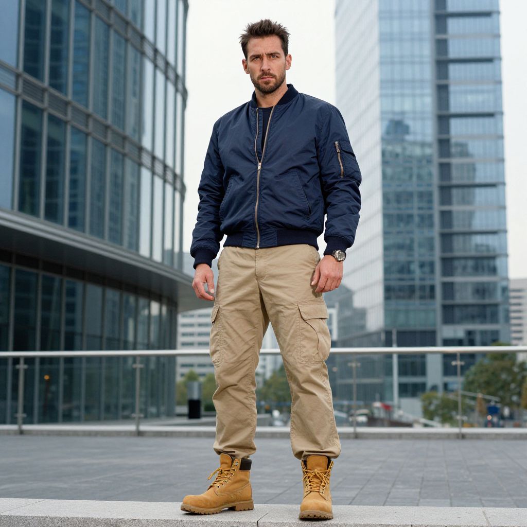 A man, navy blue bomber jacket, khaki cargo pants, desert boots, modern glass buildings, AgfaColor film, confident expression Man has masculine face and piercing eyes