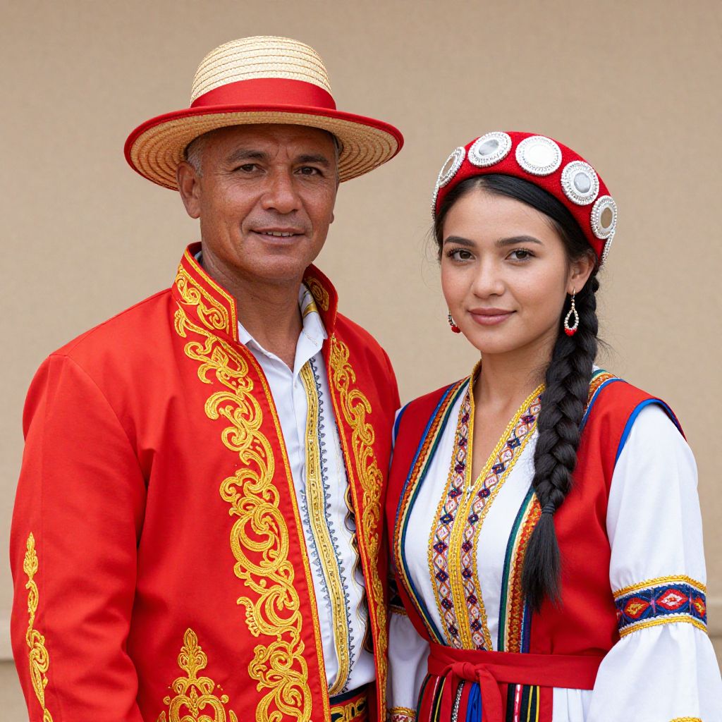 Man and woman dressed in vibrant traditional attire stand close together, the man wearing a straw hat with a red band and a red jacket with gold embroidery, while the woman dons a red headpiece adorned with circular ornaments, a braided hairstyle, and a matching red and white dress with intricate patterns.