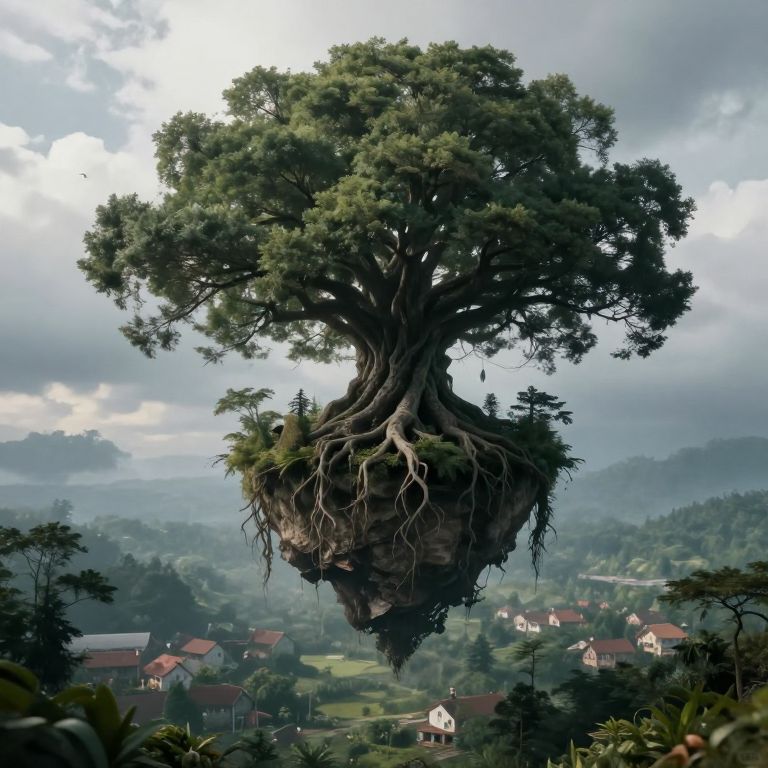 A surreal image depicting an ancient, massive tree with its roots pointing upwards, anchoring a floating island of forest above a tranquil town. The tree's dense foliage and intricately twisted roots contrast with the peaceful village and misty hills in the background under a cloudy sky.