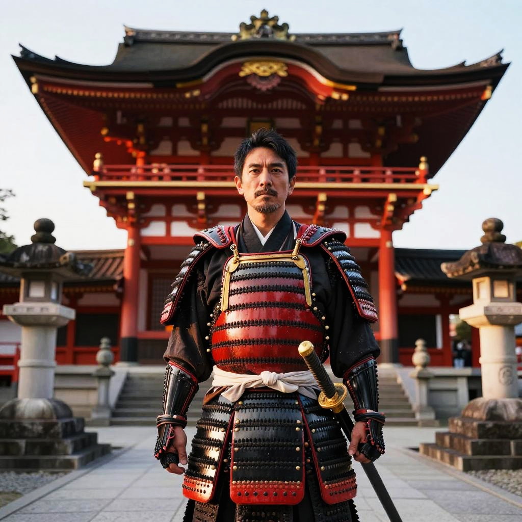 Photograph of a middle-aged Asian man with short black hair and a trimmed beard, standing confidently in front of a traditional Japanese temple. He's wearing elaborate black and red samurai armor, with a sword sheathed at his side. The background features a large, ornate temple with curved roofs and stone lanterns on either side, bathed in soft evening light.
