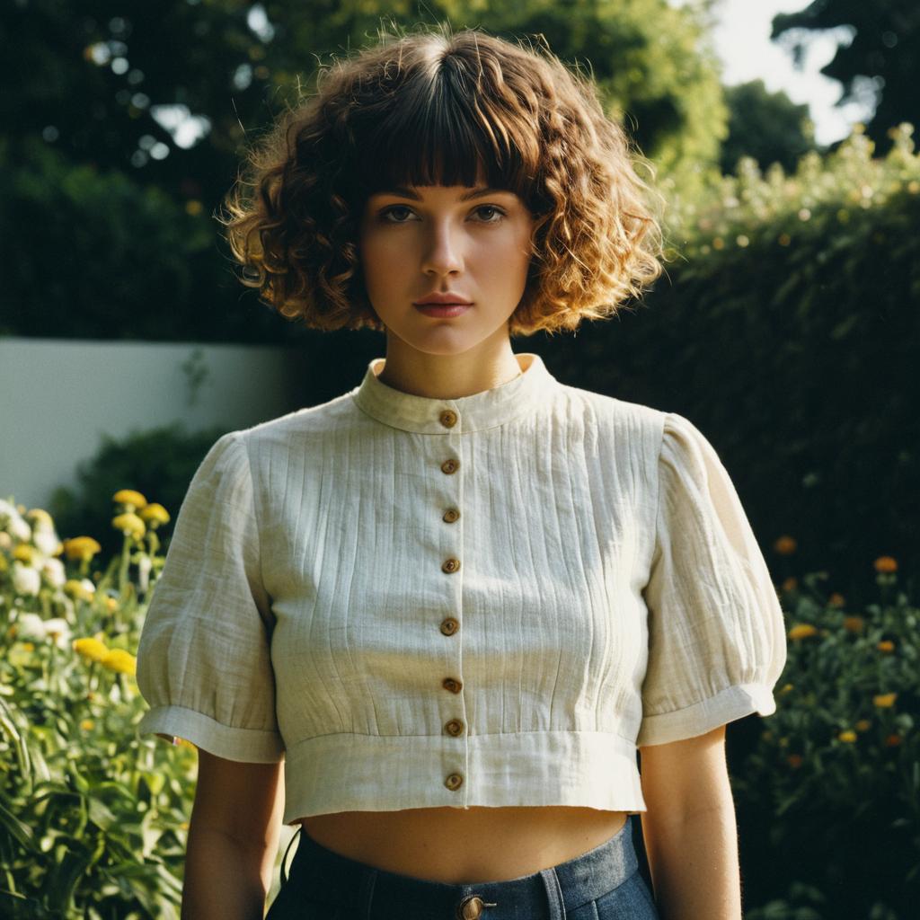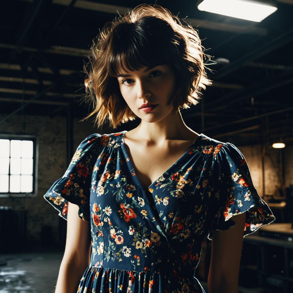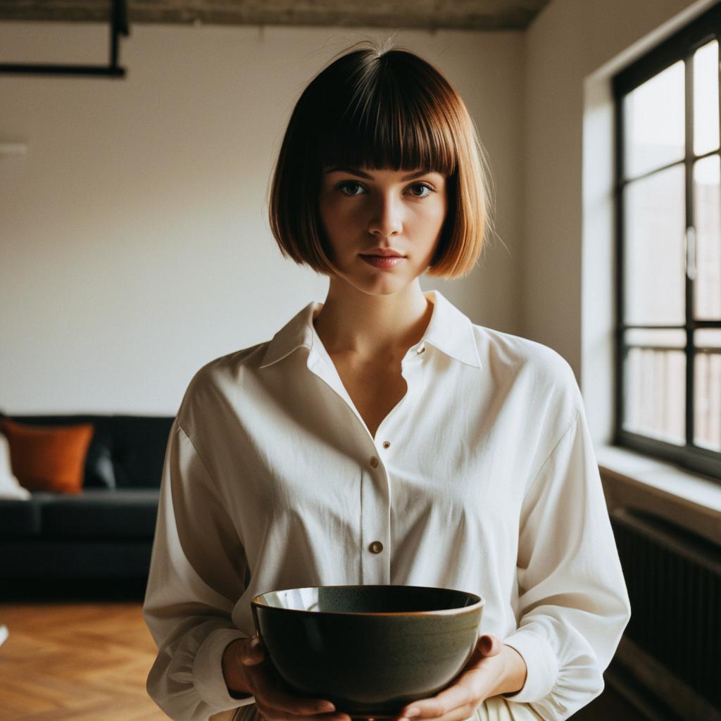 Modern Bowl Cut hairstyle on female artist, wearing minimalist jumpsuit, in modern loft, captured in fashion editorial style with natural window light.