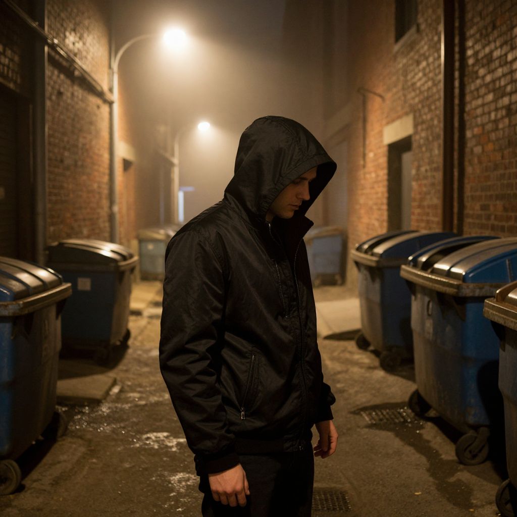 A man wearing a sleek black jacket with a hood pulled tightly over his head, standing in a dimly lit urban alley at night. The alley is narrow, lined with weathered brick walls and overflowing dumpsters, with fog curling gently around the corners. Soft, yellow streetlights cast a faint, uneven glow, creating long, dramatic shadows that stretch across the ground. His face is partially hidden beneath the hood, only the edge of his sharp jawline and a faint glimpse of a tired, determined expression visible. A slight breeze stirs the fabric of his jacket, causing the hood to shift slightly, adding a sense of movement and quiet tension to the scene. The atmosphere is mysterious, solitary, and slightly eerie, evoking a sense of isolation and unseen danger. The composition emphasizes depth and mood, with a focus on texture—gritty concrete, rusted metal, and the subtle sheen of wet surfaces—enhancing the urban realism and emotional weight of the moment.