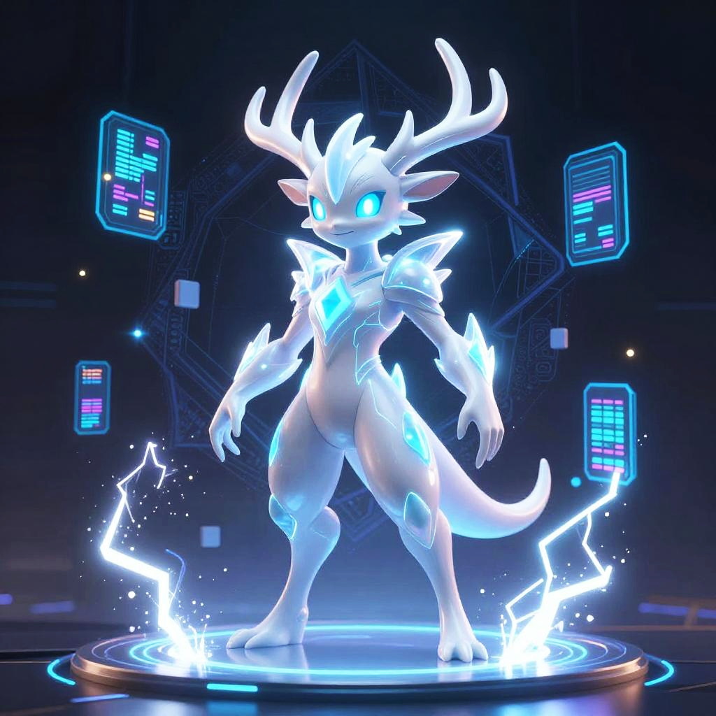 Zeraora depicted as a guardian spirit in a digital world, surrounded by holographic lightning circuits and floating data fragments, futuristic electric aura emanating from its body, neon highlights, dark background with glowing geometric patterns, stylized cyber fantasy art.