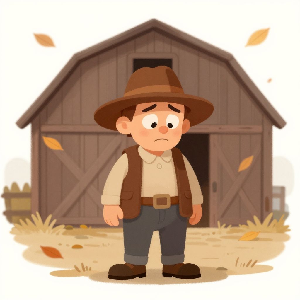 Sad farmer cartoon with downcast eyes and slumped shoulders, empty barn behind, autumn leaves blowing in the wind, muted earthy colors with subtle shading