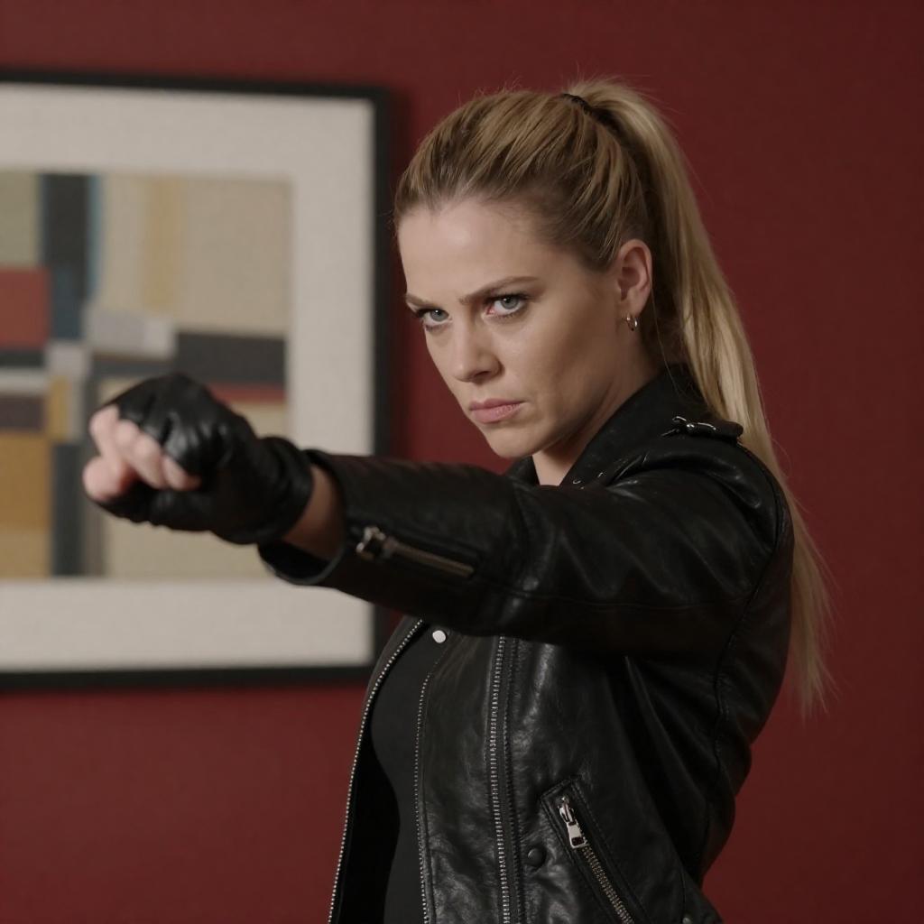 Two women in a dimly lit, fenced outdoor area. The standing woman with dark hair in a ponytail, wearing a black leather jacket, is pinning down the blonde woman with her hands on her shoulders. The blonde woman is on her back, grimacing in pain. The standing woman's face shows intense focus. Background includes blurred orange and green objects.