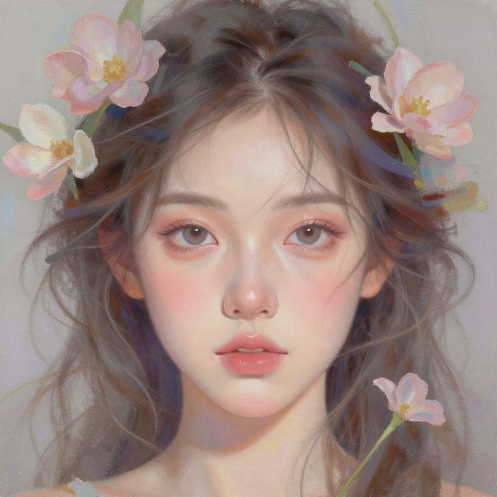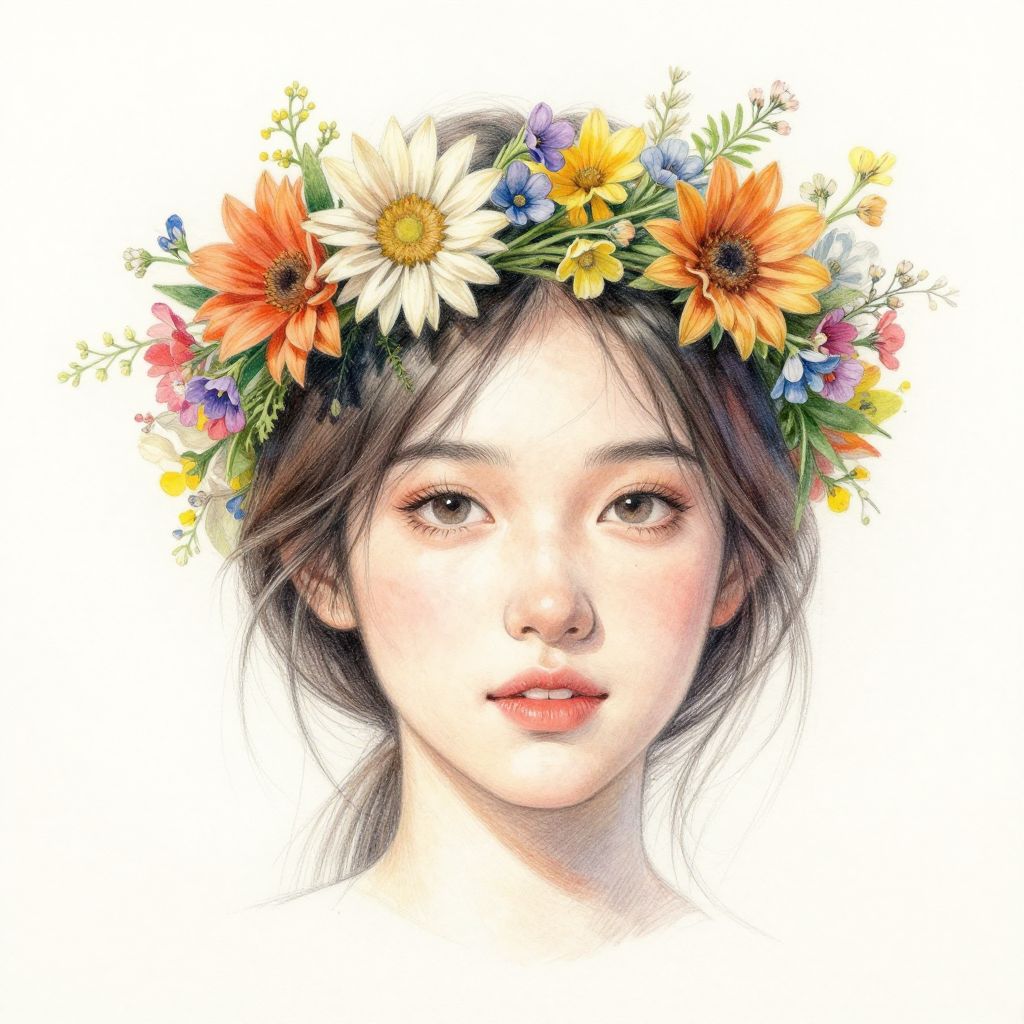 Realistic flower crown drawing, vibrant wildflowers woven together, detailed textures, pencil sketch with watercolor accents, soft shadows, close-up portrait style