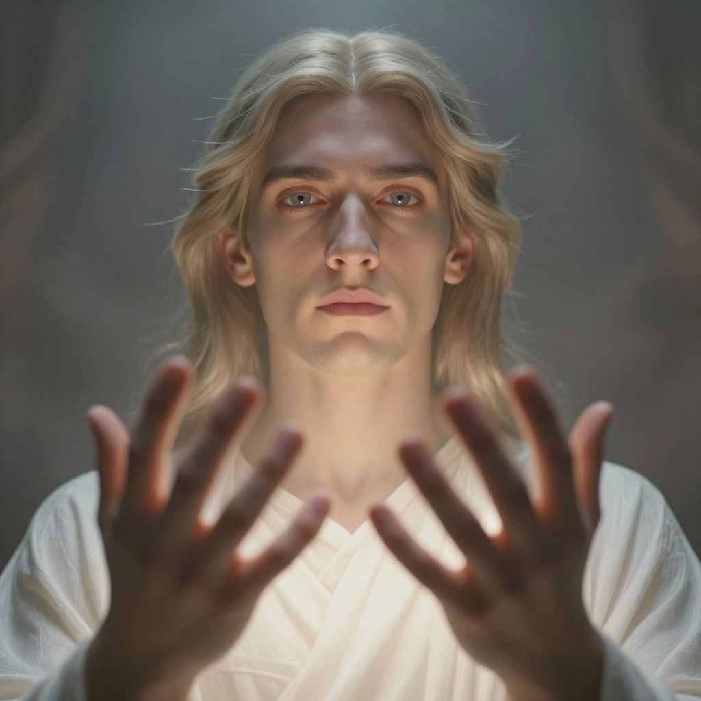 Majestic portrait, capturing the essence of divinity, soft ethereal lighting illuminates the subject's face, radiating an otherworldly presence, hands extended in reverence, dramatic shadows accentuating the scene, low-angle perspective emphasizes grandeur, divine energy emanating from his being, mystical ambiance. Man has masculine face and piercing eyes