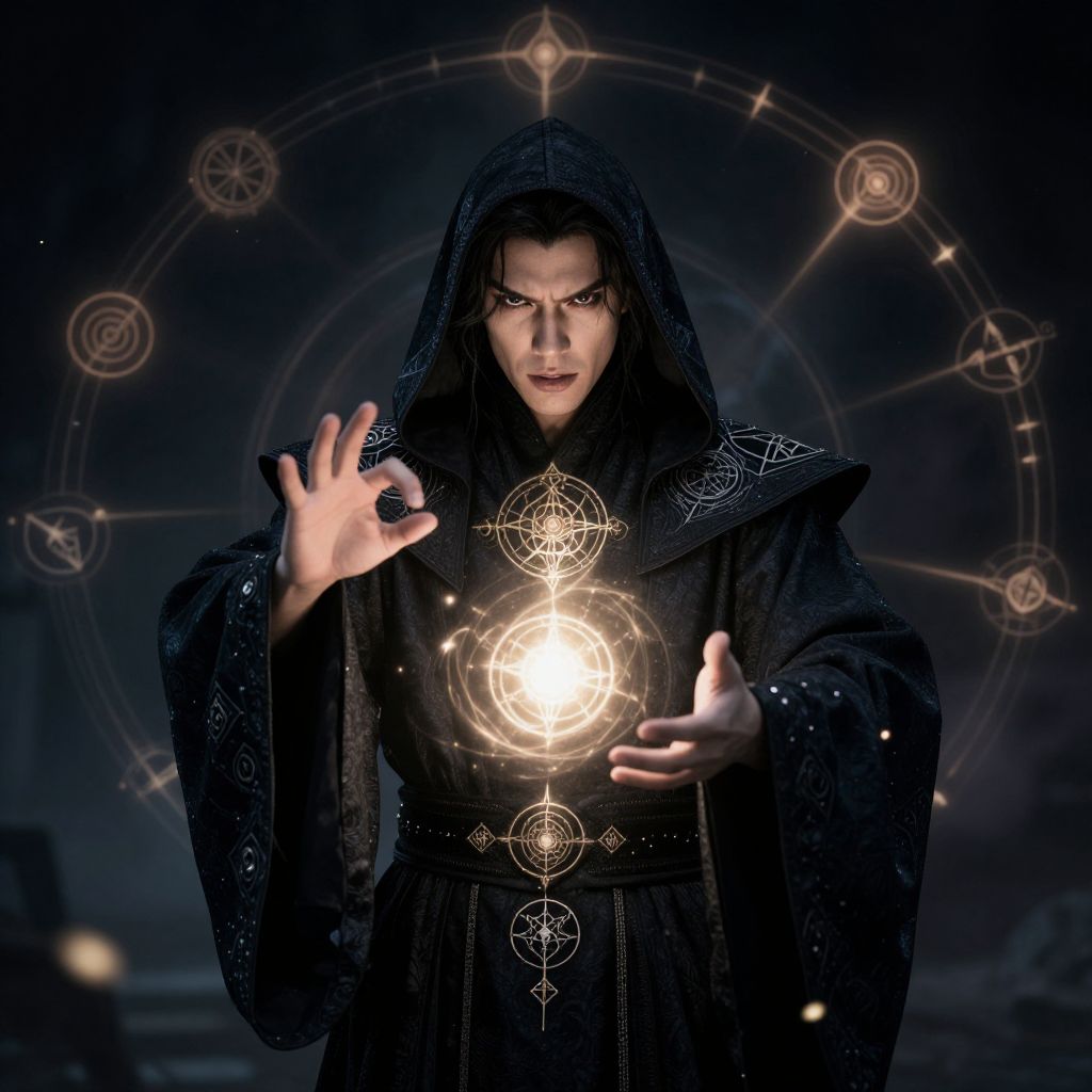 Photorealistic digital art of a blonde, fair-skinned man with blue eyes, illuminated from below, hands raised in a mystical gesture.
