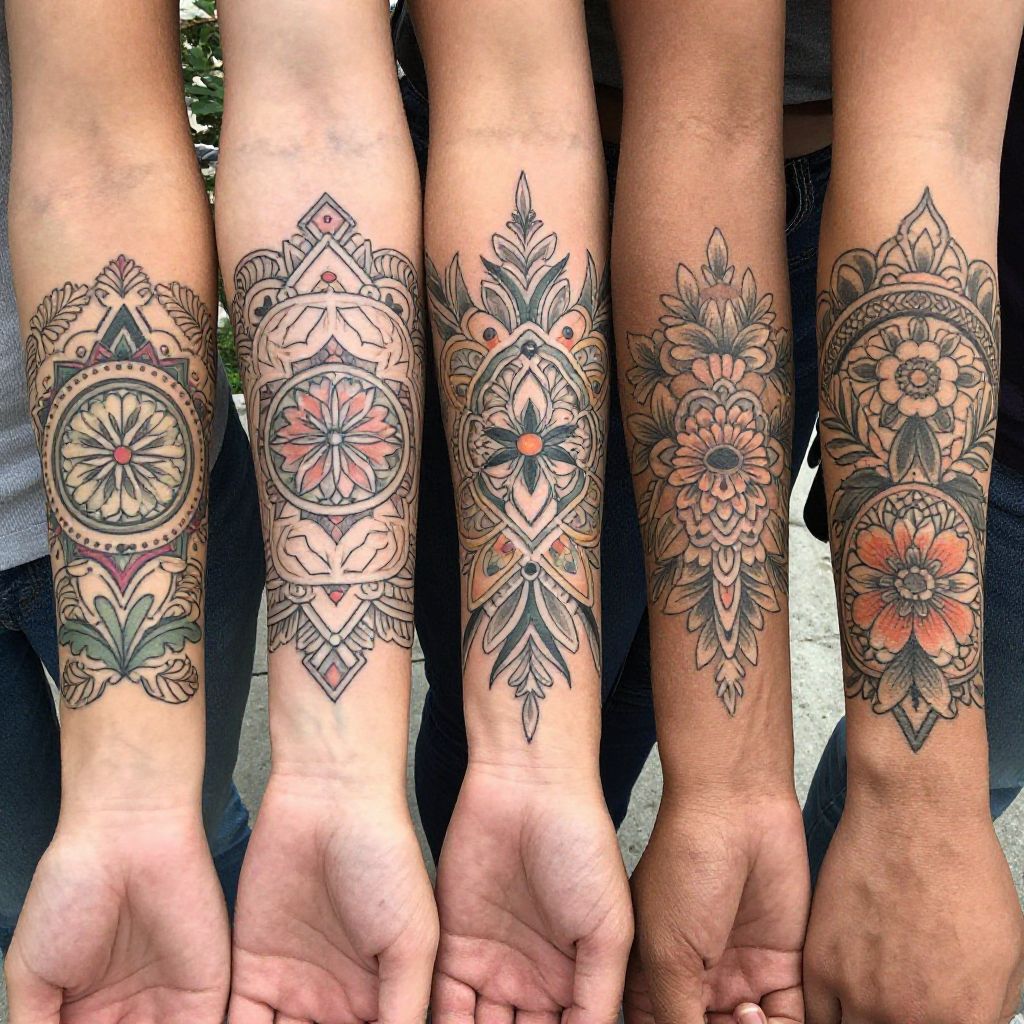 Vertical forearm tattoos adorning a variety of intricate designs, from geometric patterns to floral motifs, showcased on diverse skin tones, under natural daylight, with high detail and vibrant colors, emphasizing the elegant vertical alignment and artistic flow.