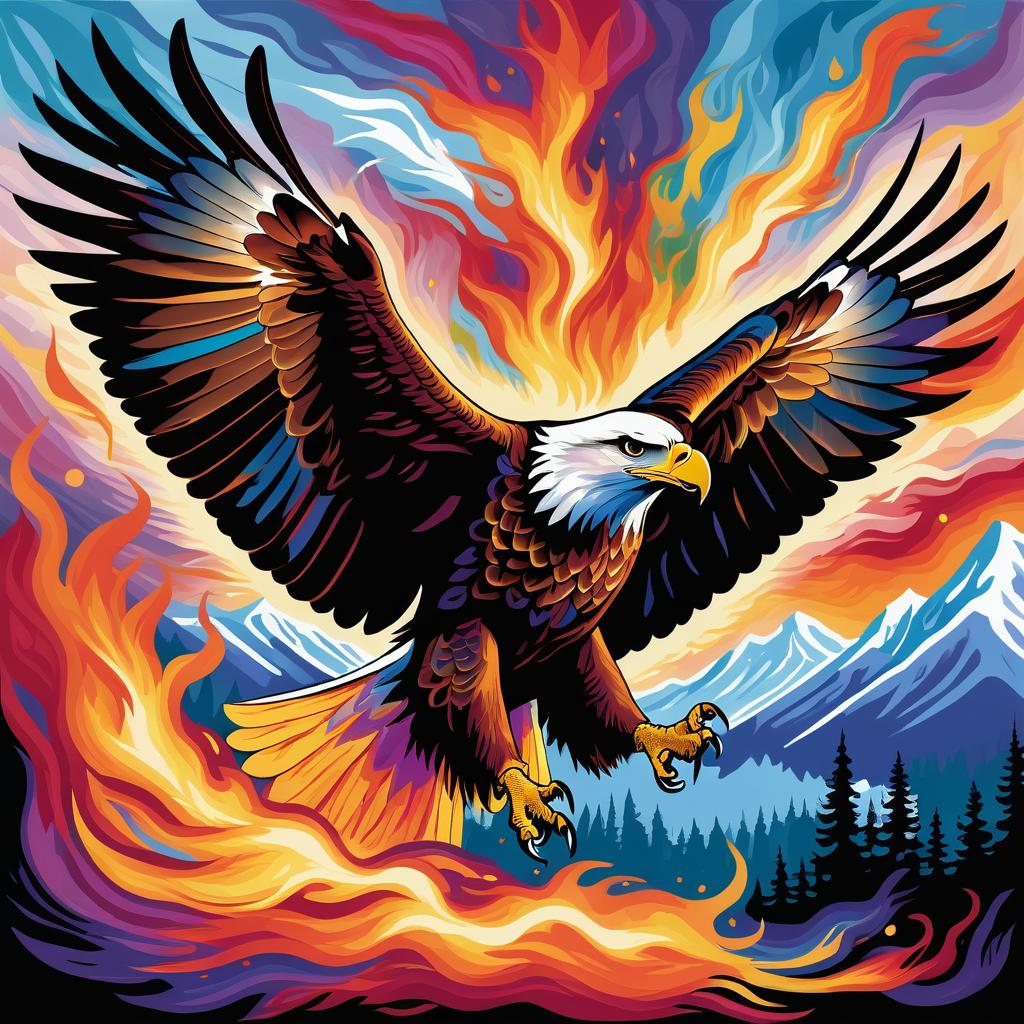 A majestic eagle soaring gracefully, unleashing a colorful display, surrounded by flames of color, in a highly detailed digital painting.