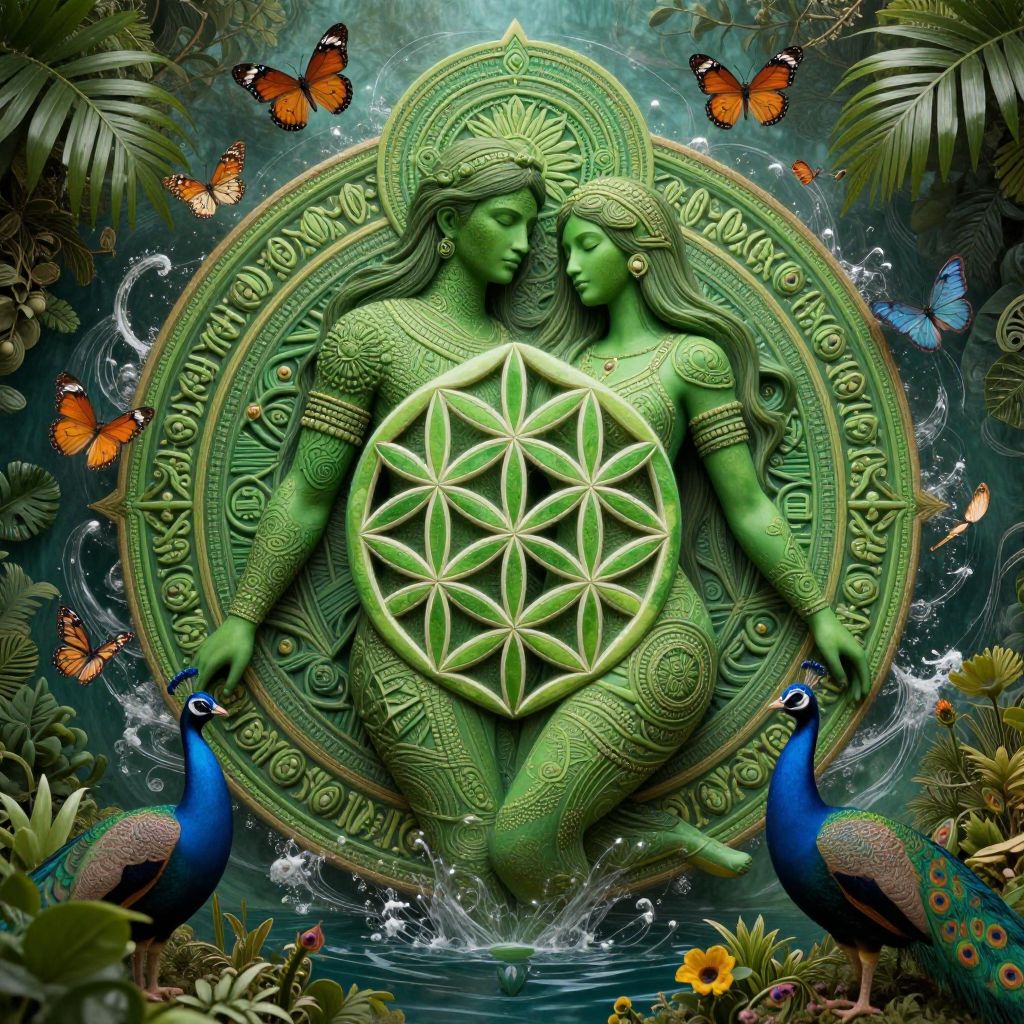 The image presents a highly detailed and intricate scene, dominated by a central figure that appears to be a fusion of a green man and a green woman, embodying a sense of peace and harmony. The figure is adorned with elaborate, symmetrical patterns and textures, reminiscent of sacred geometry, such as the seed of life and the star gate, symbolizing the connection between the natural world and the spiritual realm. Surrounding the central figure are various elements that enhance the theme of nature and spirituality, including butterflies, peacocks, and plants, all rendered with extreme photorealism and hyper-realistic detail. The composition is balanced, with the central figure positioned at the core, surrounded by a symmetrical arrangement of elements that create a sense of depth and dimensionality. The use of vibrant green hues and intricate textures gives the image a sense of movement and life, as if the elements are dancing with the waters, creating a dynamic and immersive visual experience. The overall effect is one of harmony and balance, reflecting the interconnectedness of all things in the multiverse.