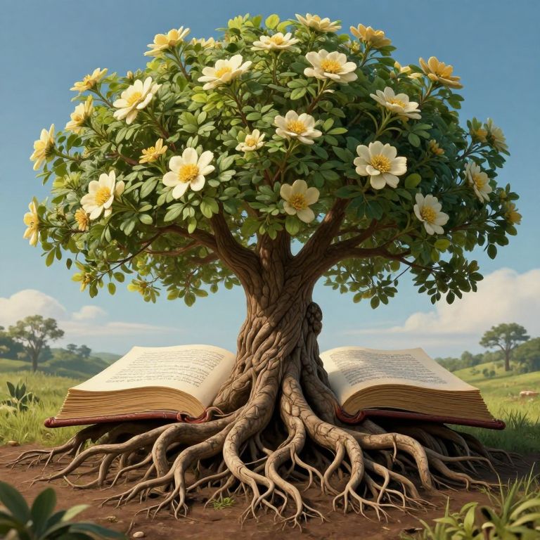 Digital illustration of a tree with white flowers, its roots intertwining with an open book, set in a sunny, grassy field.