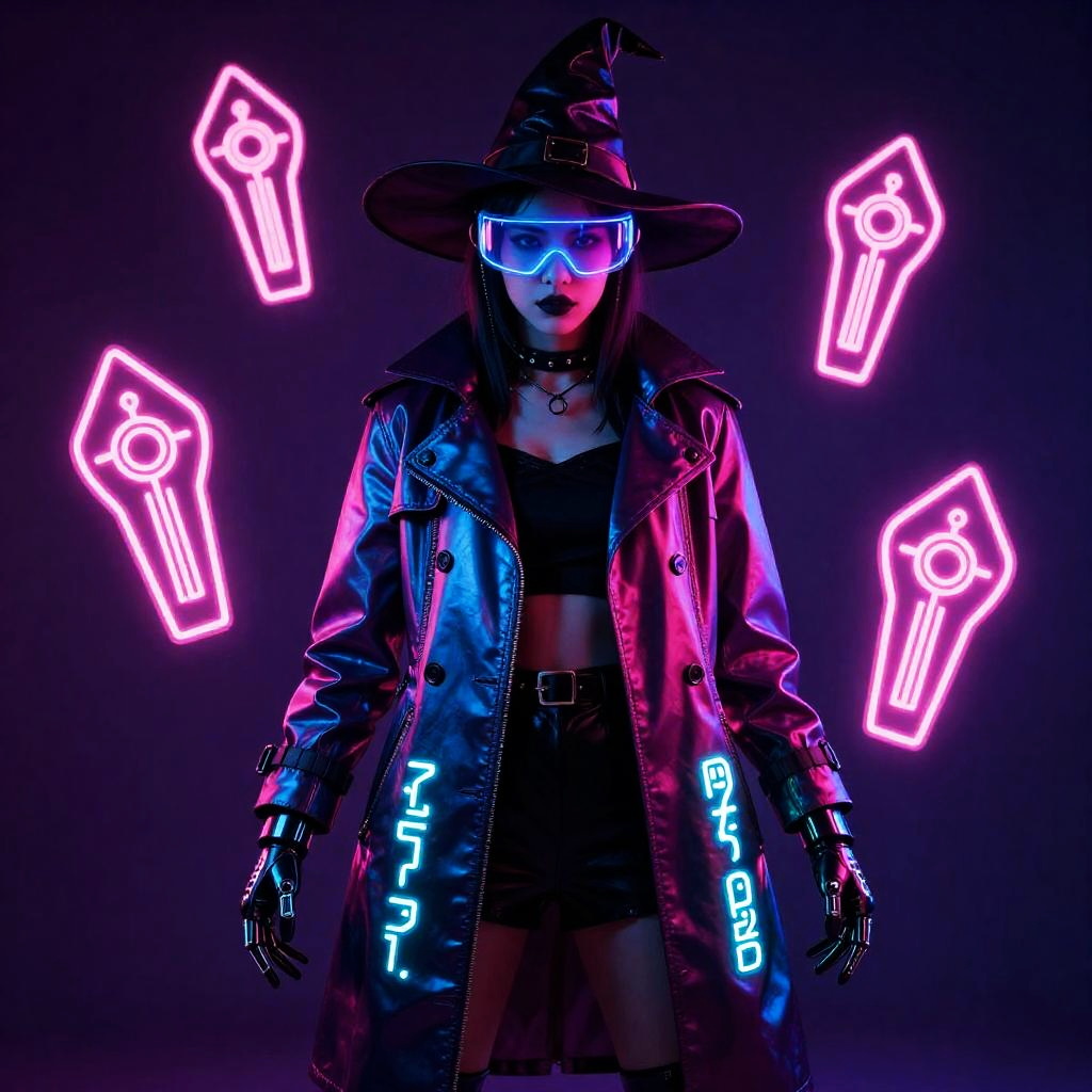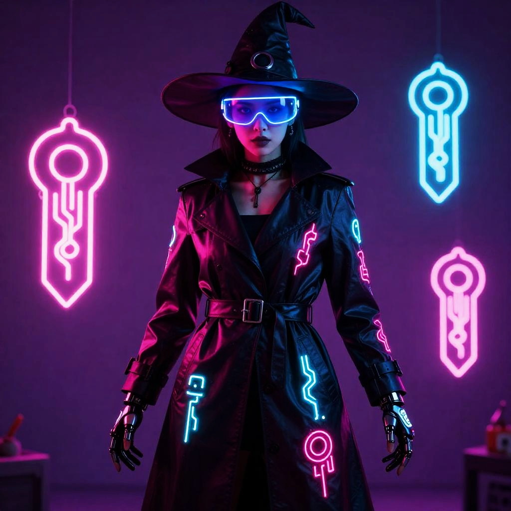 Halloween outfit, worn by neon cyberpunk witch, featuring holographic trench coat embroidered with LED runes, augmented-reality visor, fingerless cybernetic gloves with glowing circuit tattoos, floating neon talismans, in hot magenta, electric cyan, and obsidian black.