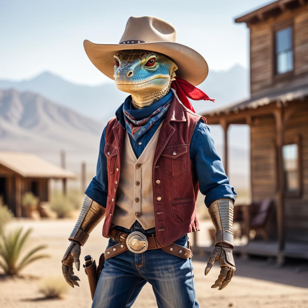 A small anthropomorphic lizard dressed as a cowboy, wearing a large beige cowboy hat, red bandana, brown vest, and blue shirt, standing in a sunlit desert environment with blurred rustic buildings and distant mountains, warm golden sunlight, highly detailed texture on skin and clothing, cinematic lighting emphasizing the whimsical and adventurous mood