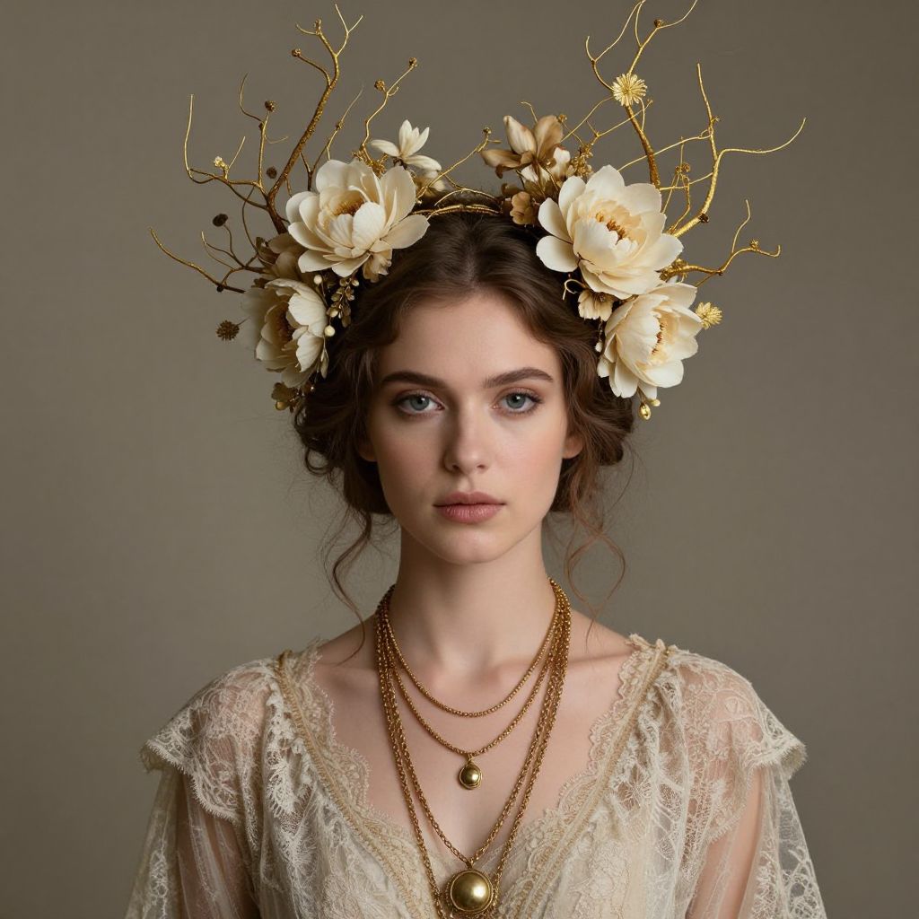 Ethereal woman adorned with a fantastical floral crown composed of intricate golden tendrils and delicate cream-colored flowers, complemented by layered gold necklaces and a vintage lace dress, evoking a surreal, otherworldly elegance.